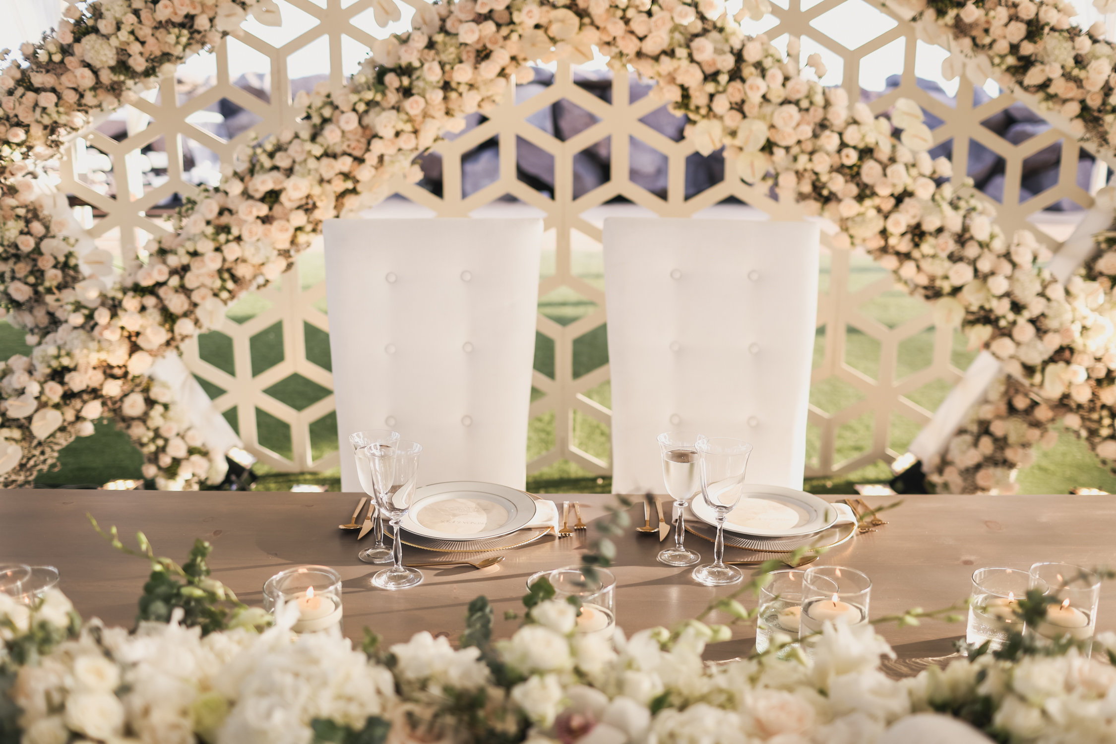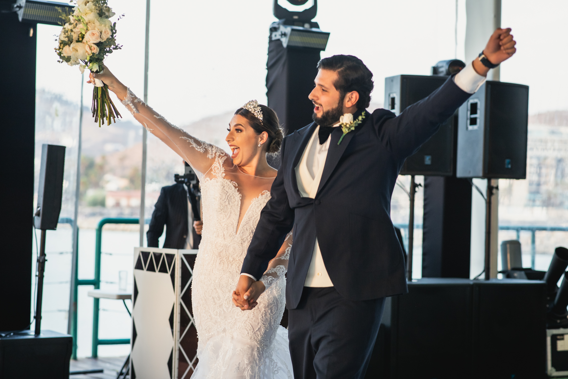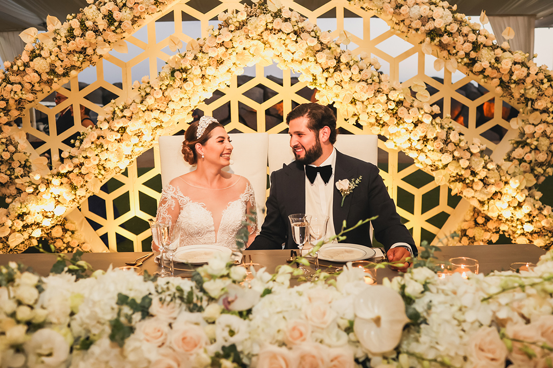 Their church ceremony was full of beauty and grace, punctuated by spectacular arrangements and personal floral that accentuated the bride’s exquisite gown and wedding party’s attire. Following the nuptials, their guests were invited to the majestic La Isla de Hotel Coral & Marina for a seaside reception. The captivating view was enhanced by floral and décor designed in seasonal tones. The couple’s grand entrance by helicopter was a stunning surprise for guests and set an excitement for the evening.