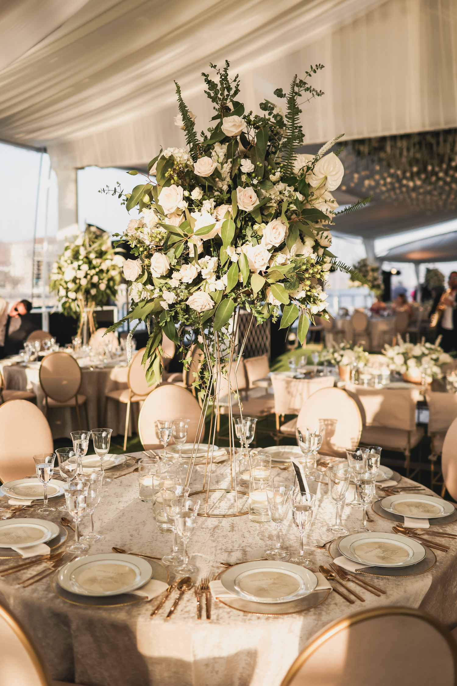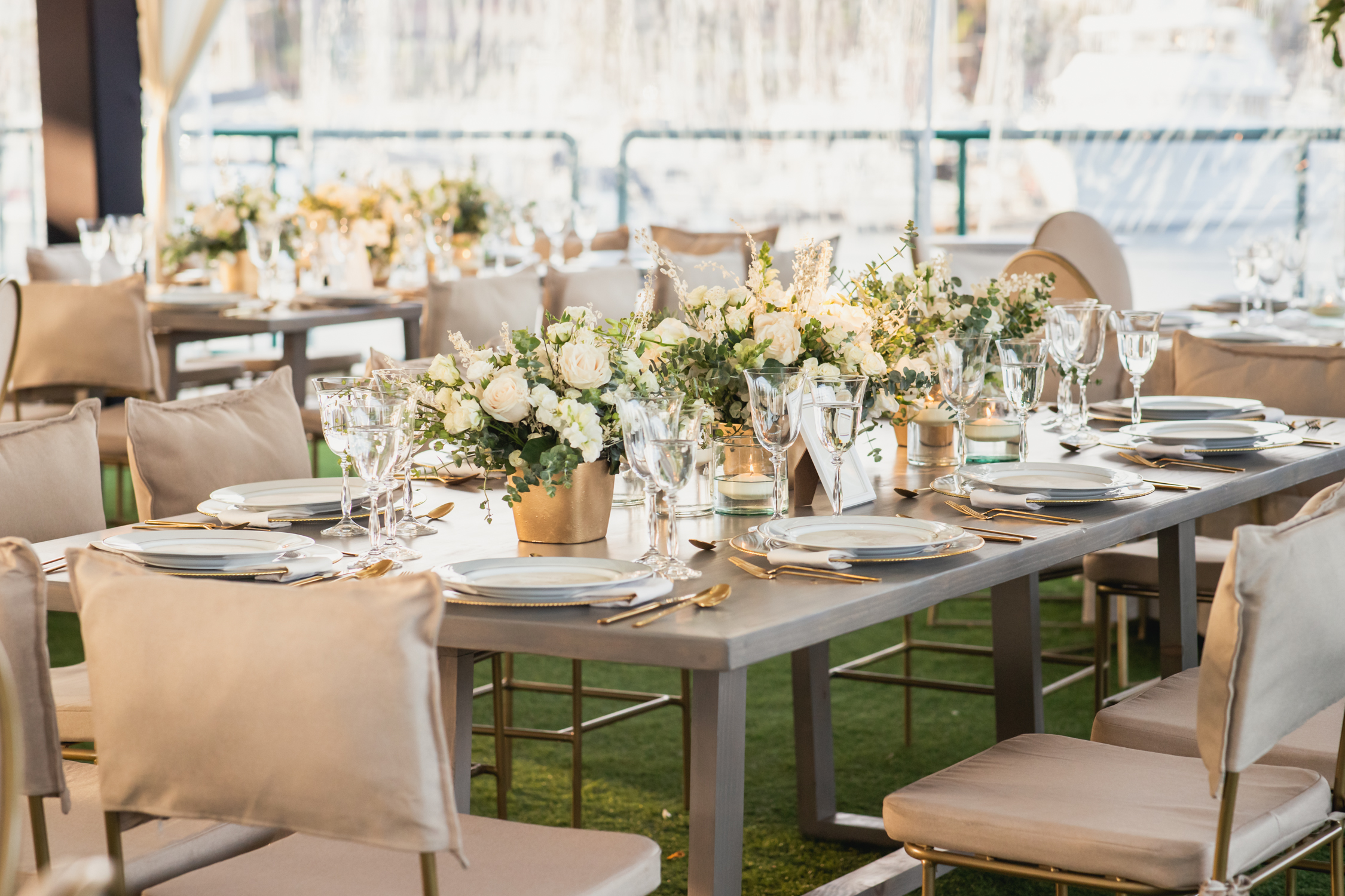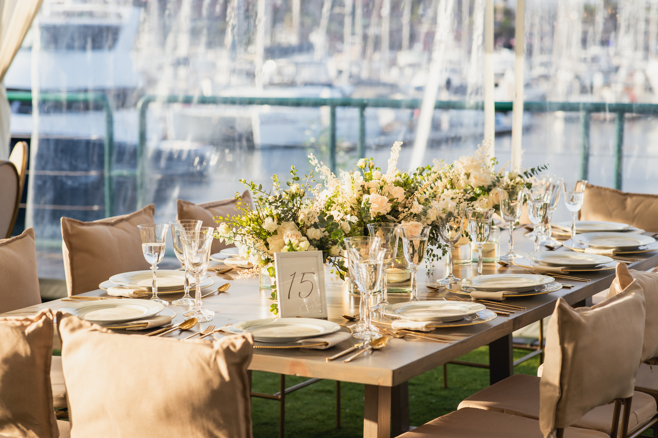 Their church ceremony was full of beauty and grace, punctuated by spectacular arrangements and personal floral that accentuated the bride’s exquisite gown and wedding party’s attire. Following the nuptials, their guests were invited to the majestic La Isla de Hotel Coral & Marina for a seaside reception. The captivating view was enhanced by floral and décor designed in seasonal tones. The couple’s grand entrance by helicopter was a stunning surprise for guests and set an excitement for the evening.