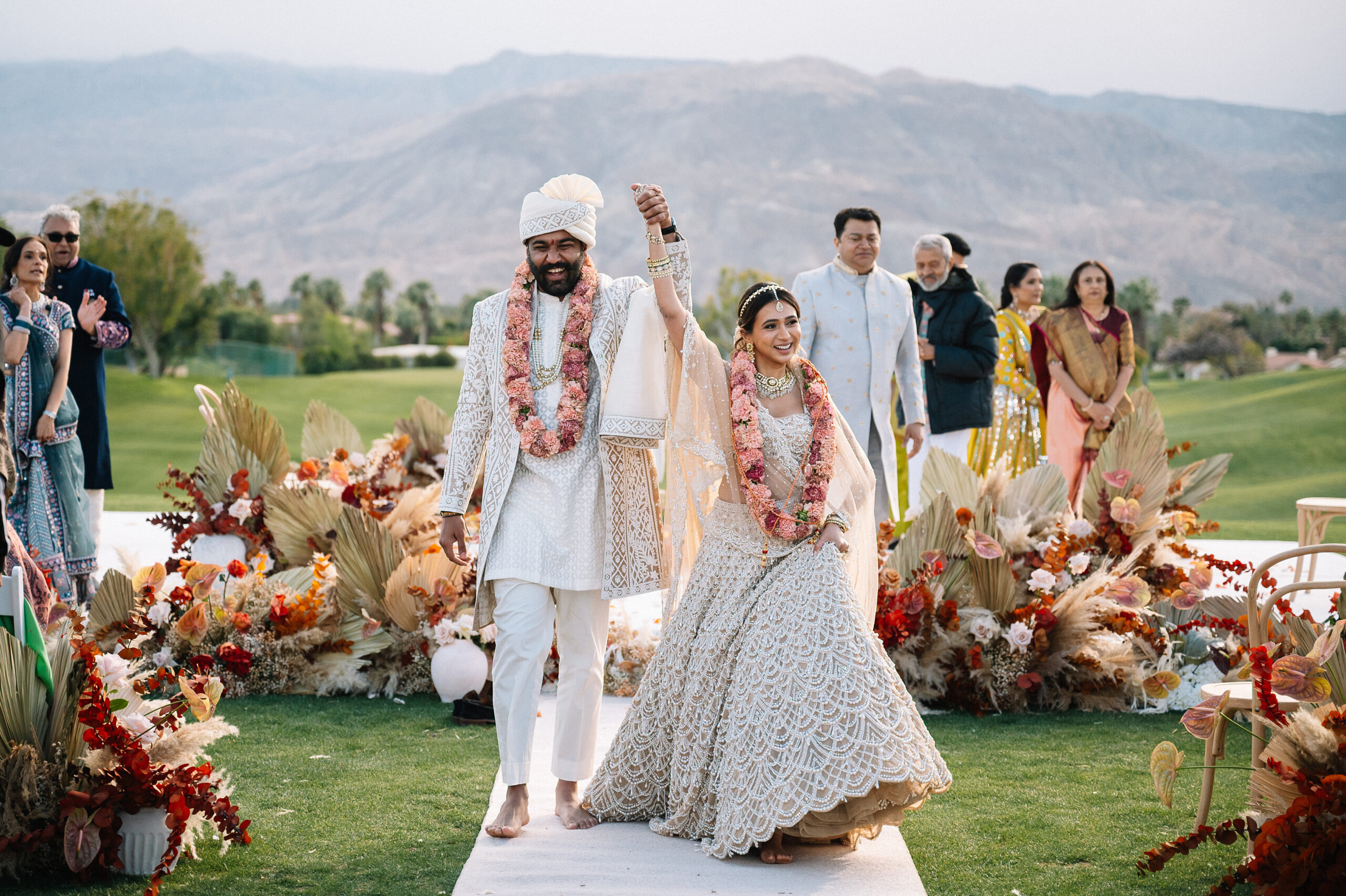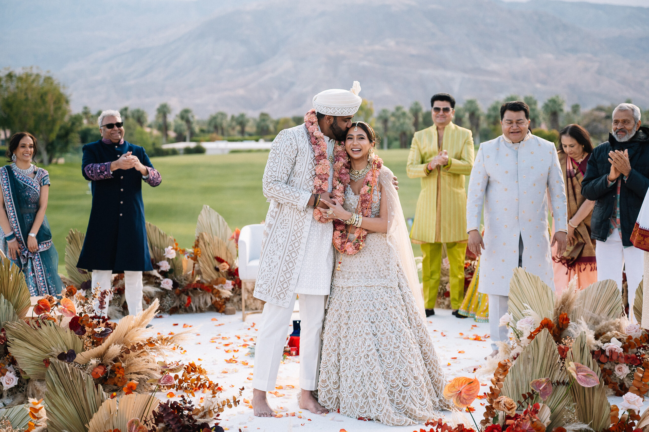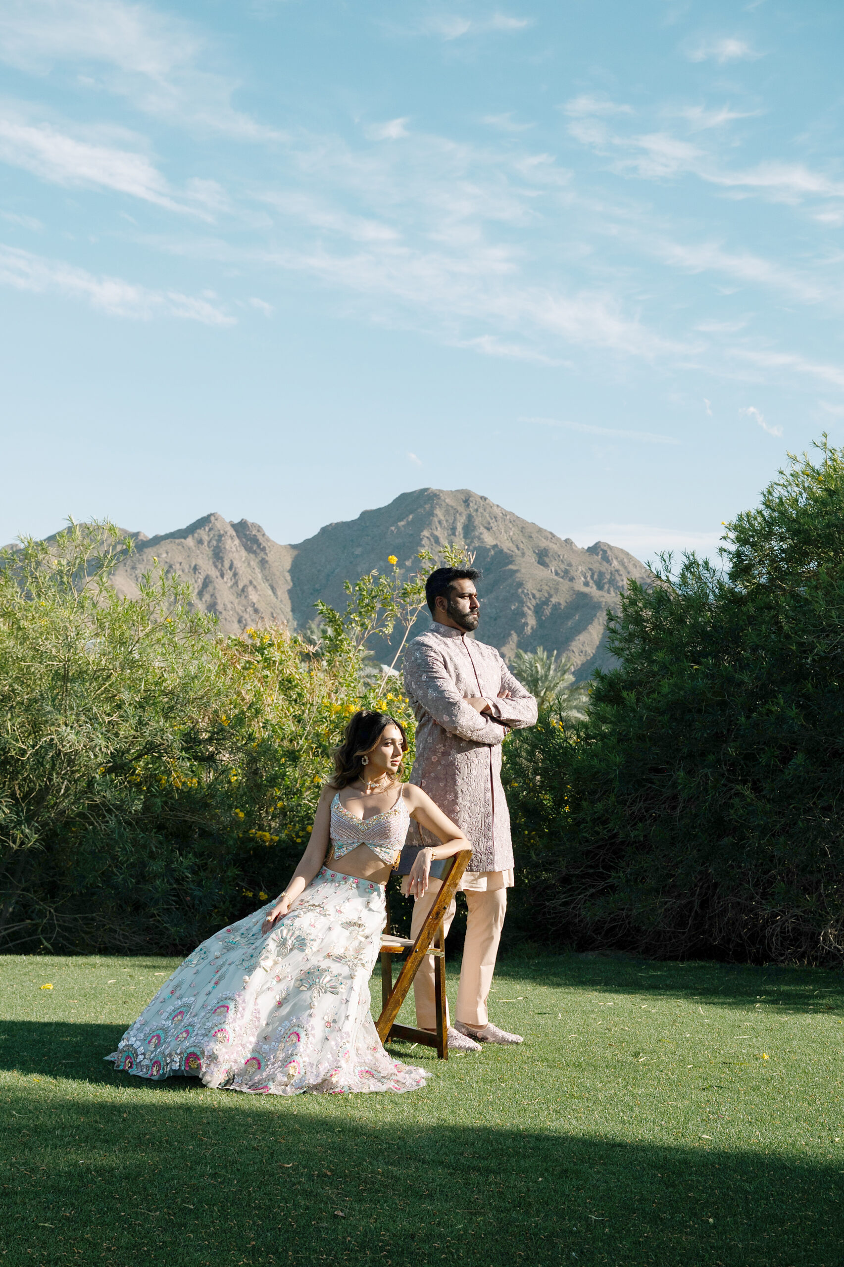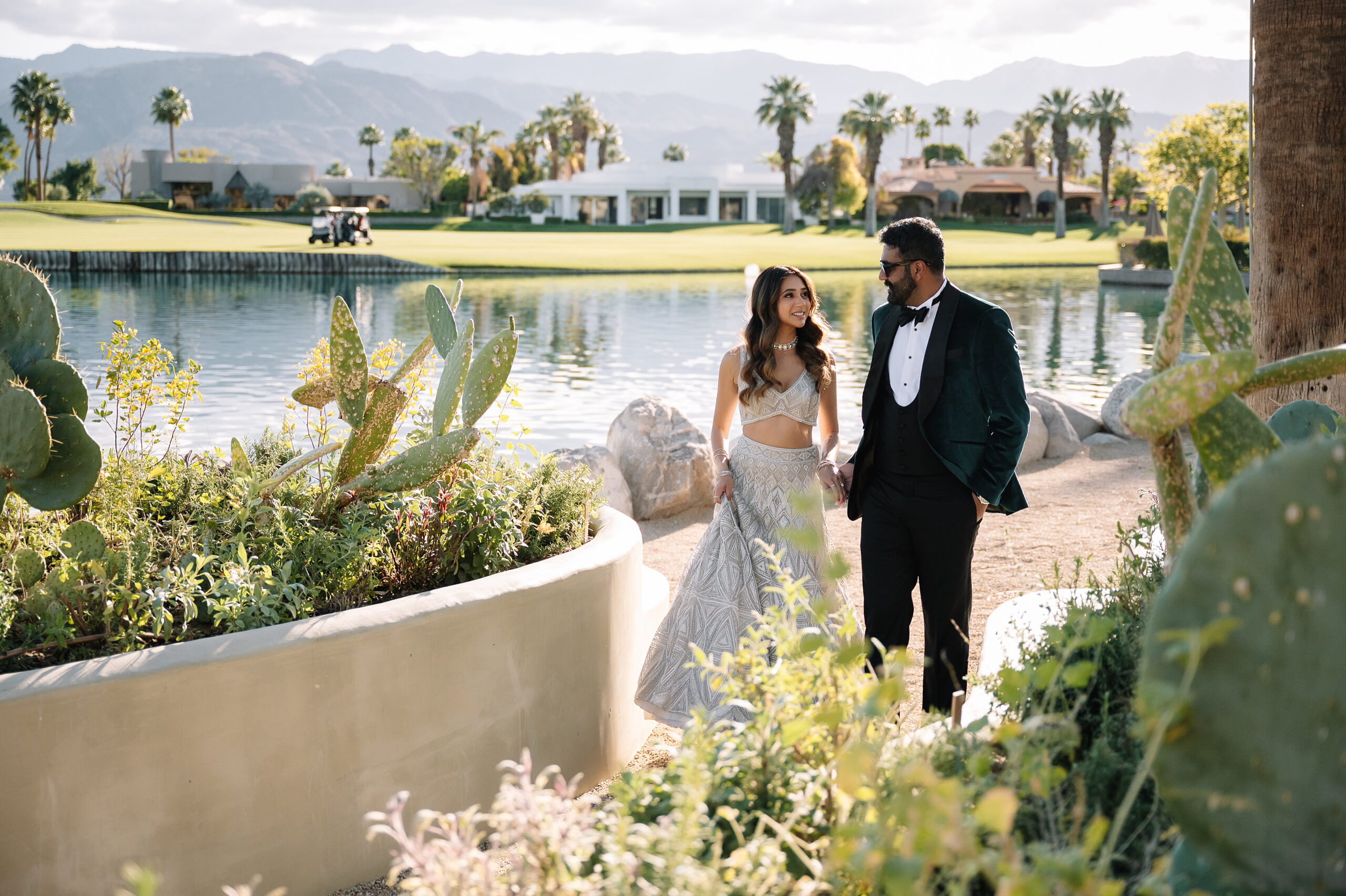Their wedding day hosted a myriad of pastel colors, with a theme of desert gardens. The bride’s outfit featured Indian designer Seema Gujral’s fantastic Nude Pearl Drop Lehenga set. The ceremony was held at the driving range at JW Marriott Desert Springs Resort and Spa, featuring light rustic colors and clay pots. They wanted the formalities to be unique to their time with an emphasis on two families becoming one. Both parents participated with a joining of hands, while setting a record for the shortest ever Hindu wedding ceremony of only 50 minutes.