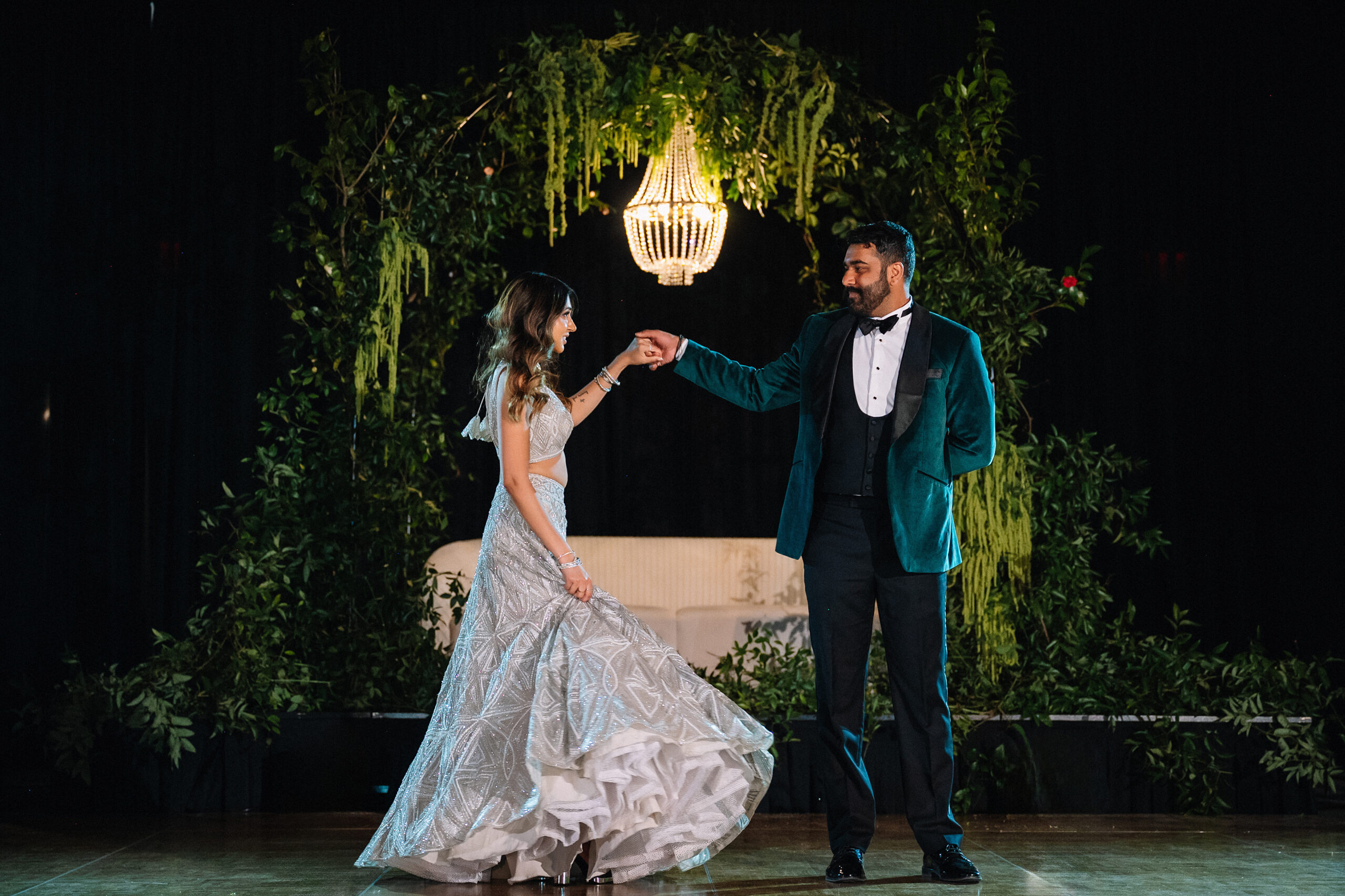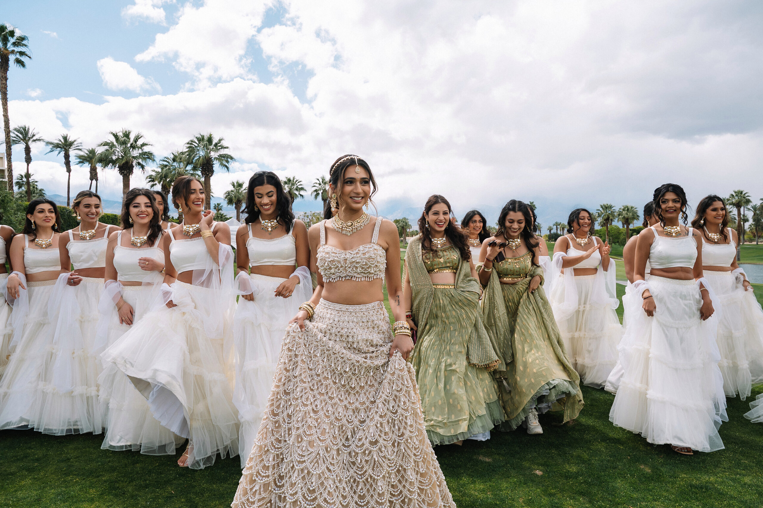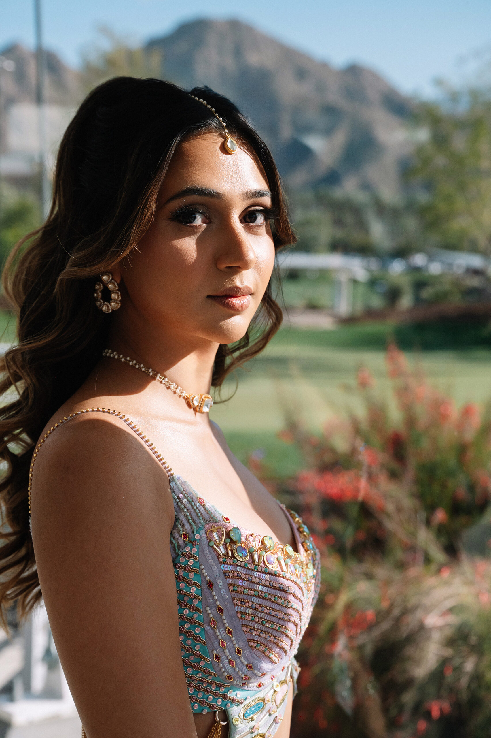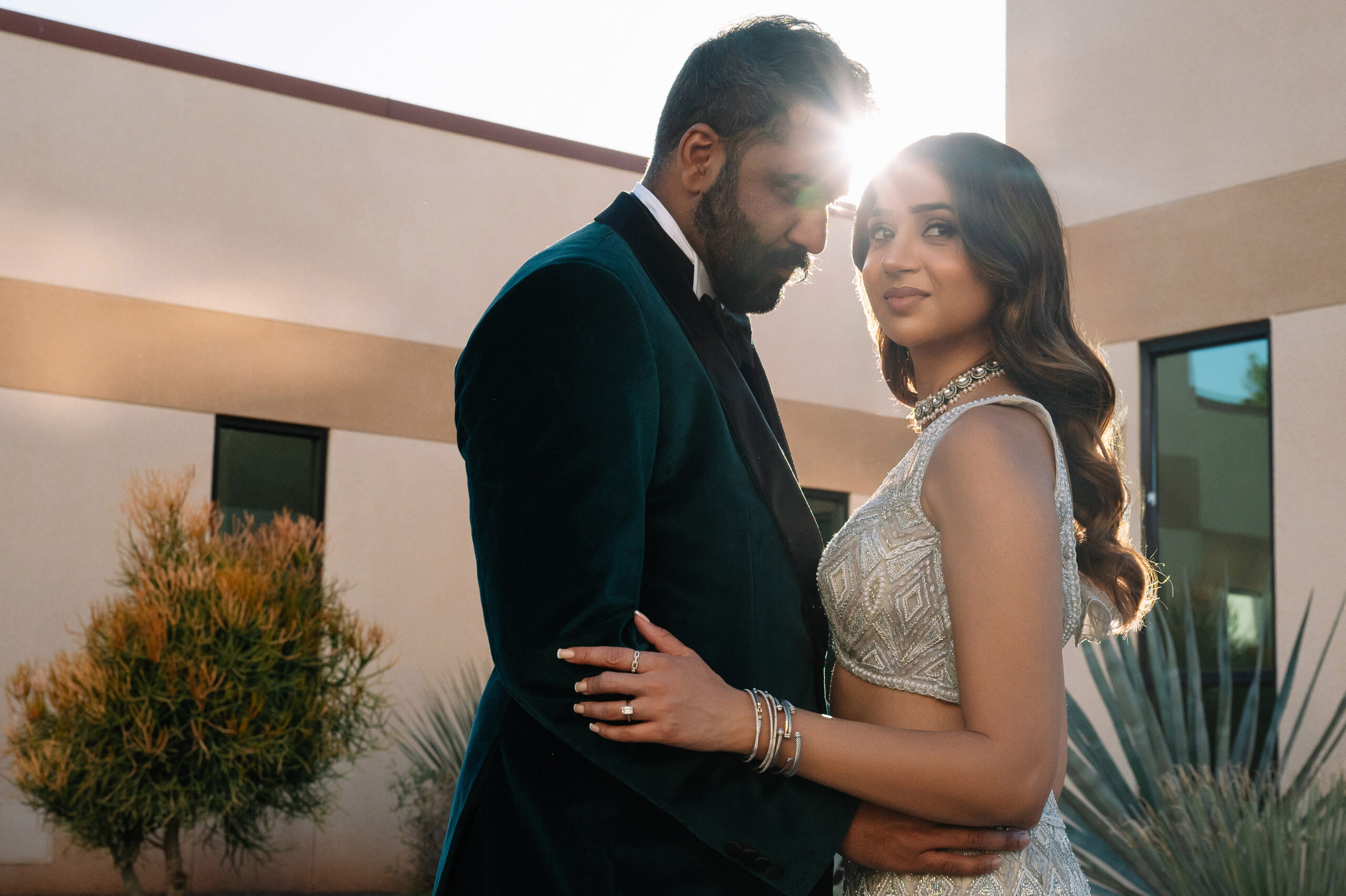 Their wedding day hosted a myriad of pastel colors, with a theme of desert gardens. The bride’s outfit featured Indian designer Seema Gujral’s fantastic Nude Pearl Drop Lehenga set. The ceremony was held at the driving range at JW Marriott Desert Springs Resort and Spa, featuring light rustic colors and clay pots. They wanted the formalities to be unique to their time with an emphasis on two families becoming one. Both parents participated with a joining of hands, while setting a record for the shortest ever Hindu wedding ceremony of only 50 minutes.