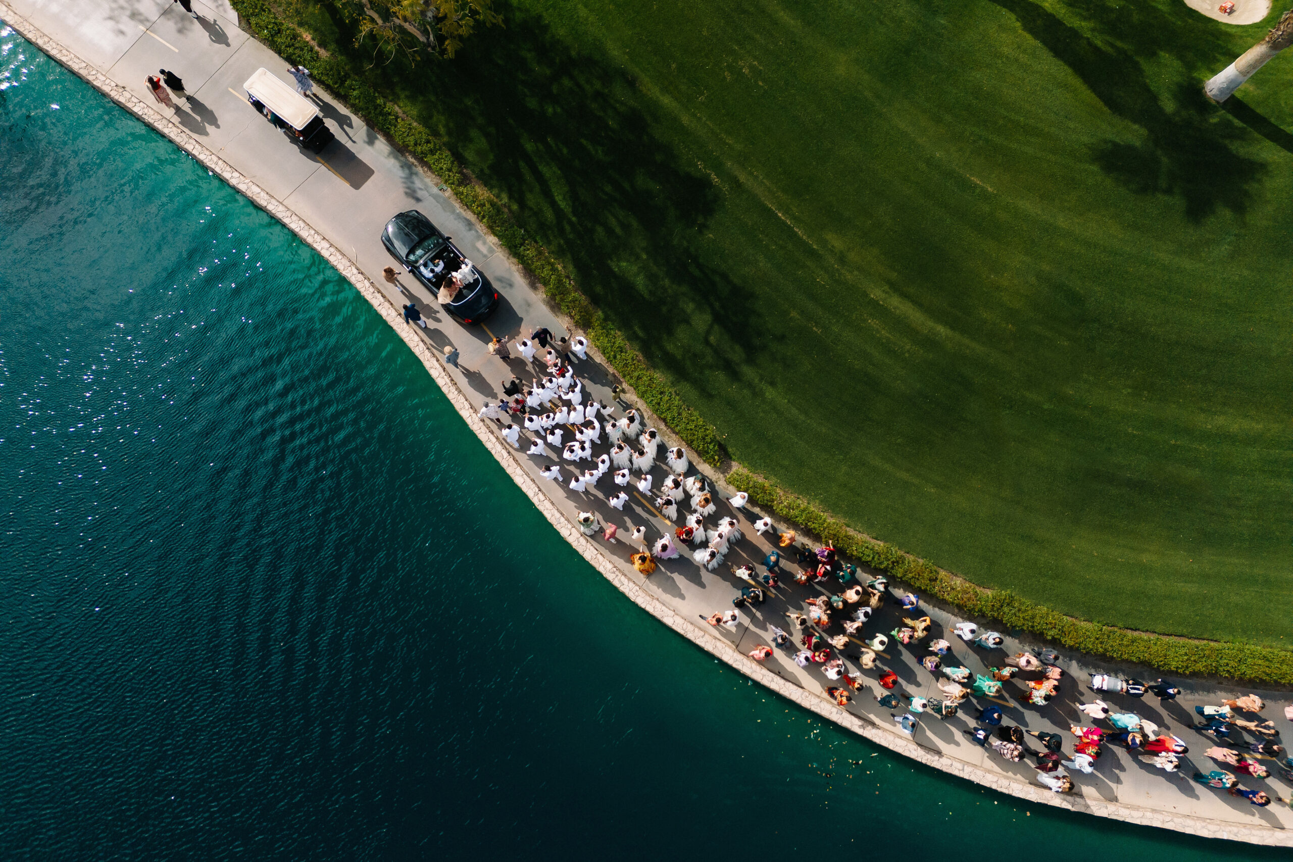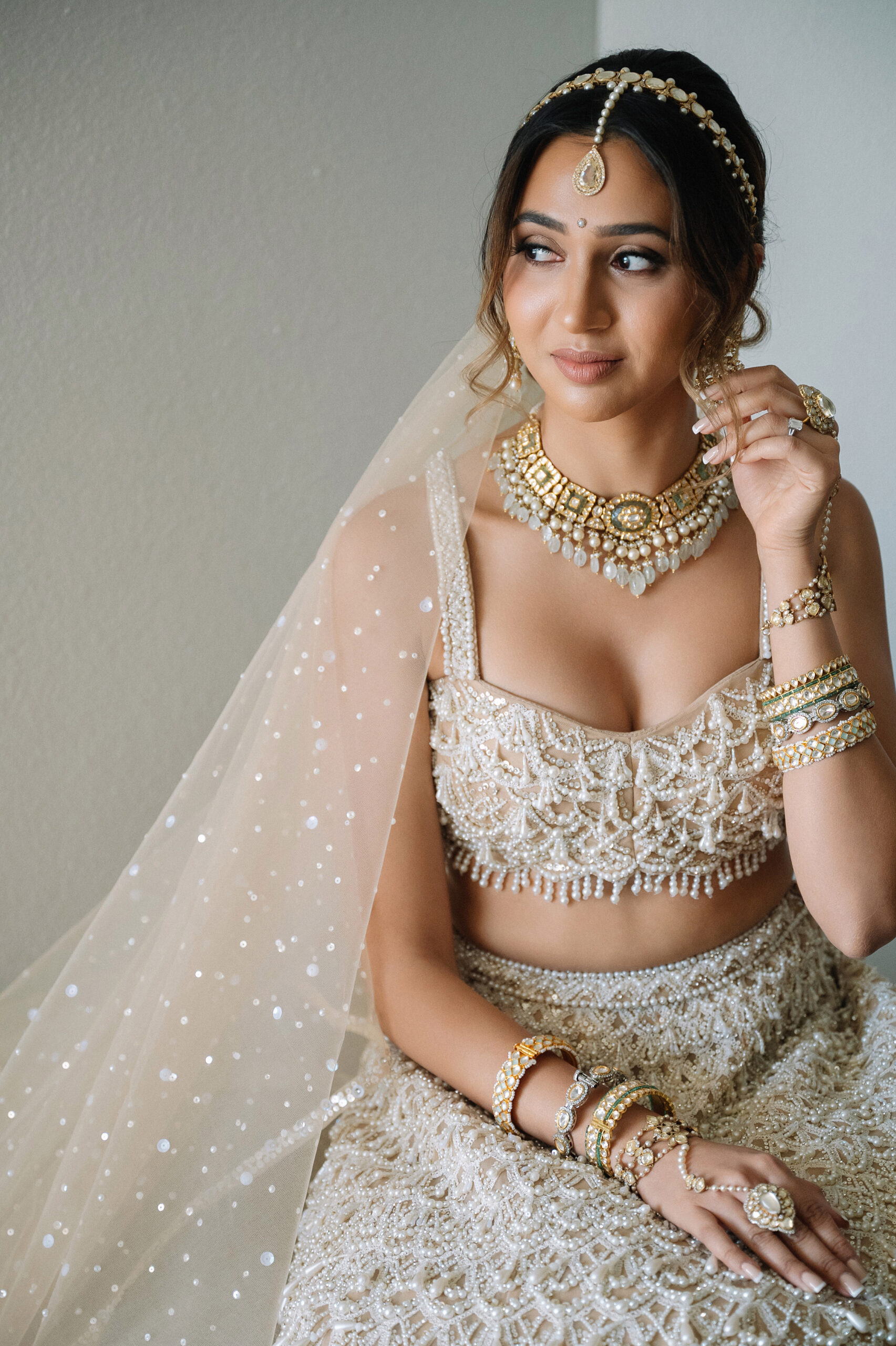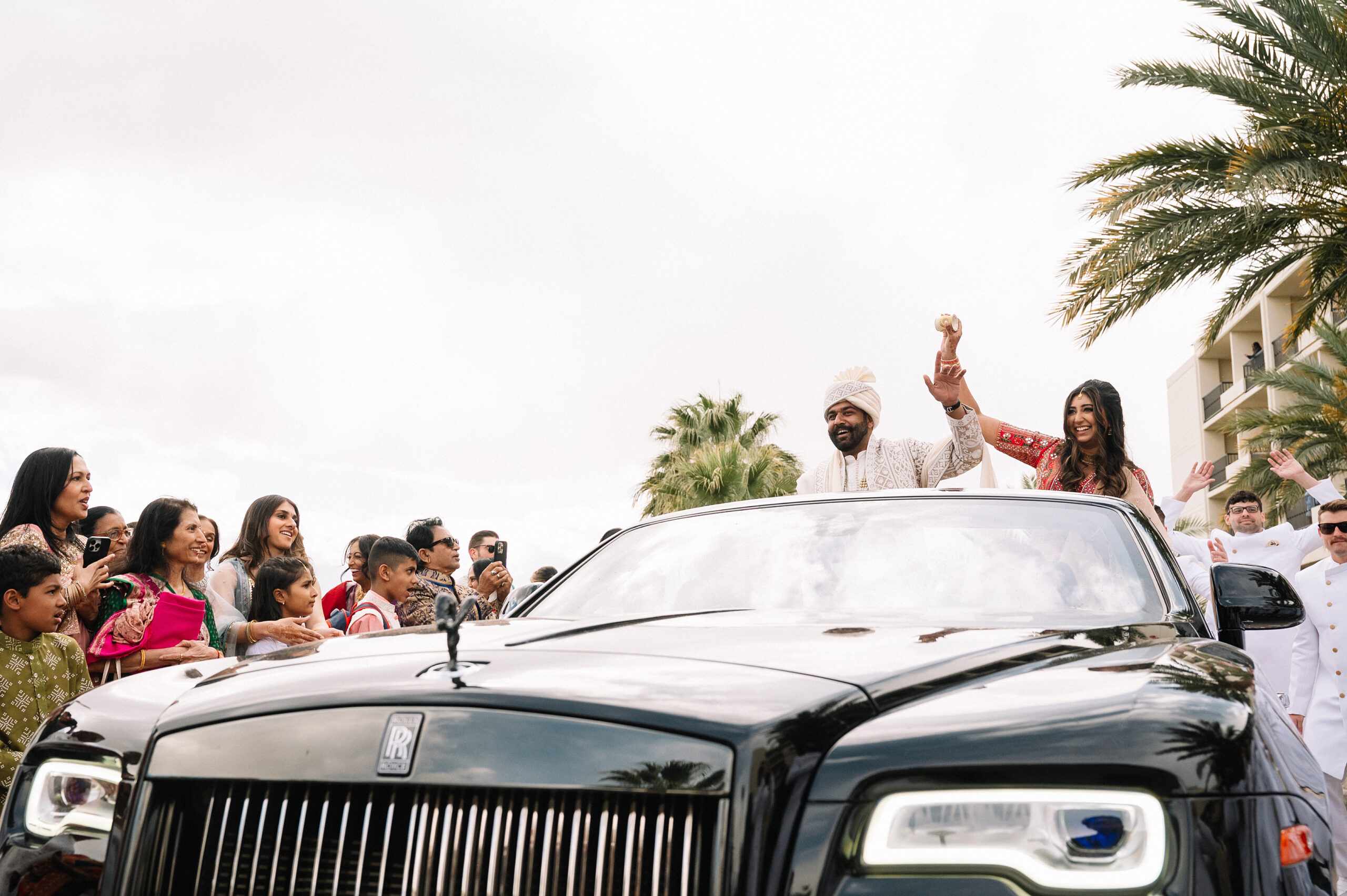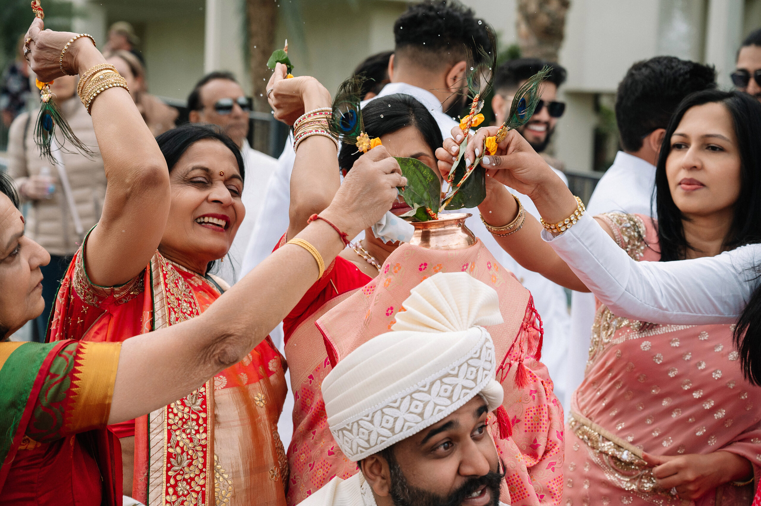Their wedding day hosted a myriad of pastel colors, with a theme of desert gardens. The bride’s outfit featured Indian designer Seema Gujral’s fantastic Nude Pearl Drop Lehenga set. The ceremony was held at the driving range at JW Marriott Desert Springs Resort and Spa, featuring light rustic colors and clay pots. They wanted the formalities to be unique to their time with an emphasis on two families becoming one. Both parents participated with a joining of hands, while setting a record for the shortest ever Hindu wedding ceremony of only 50 minutes.