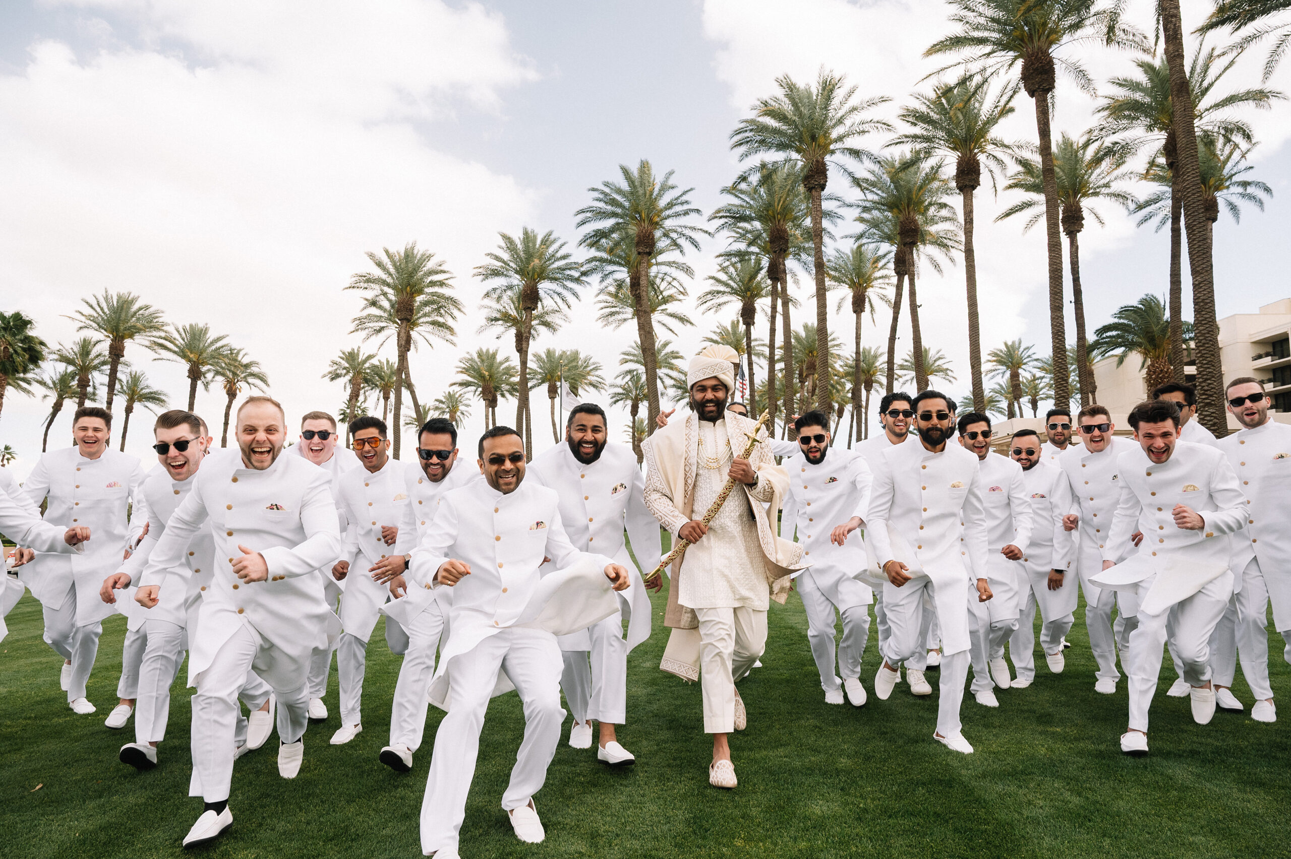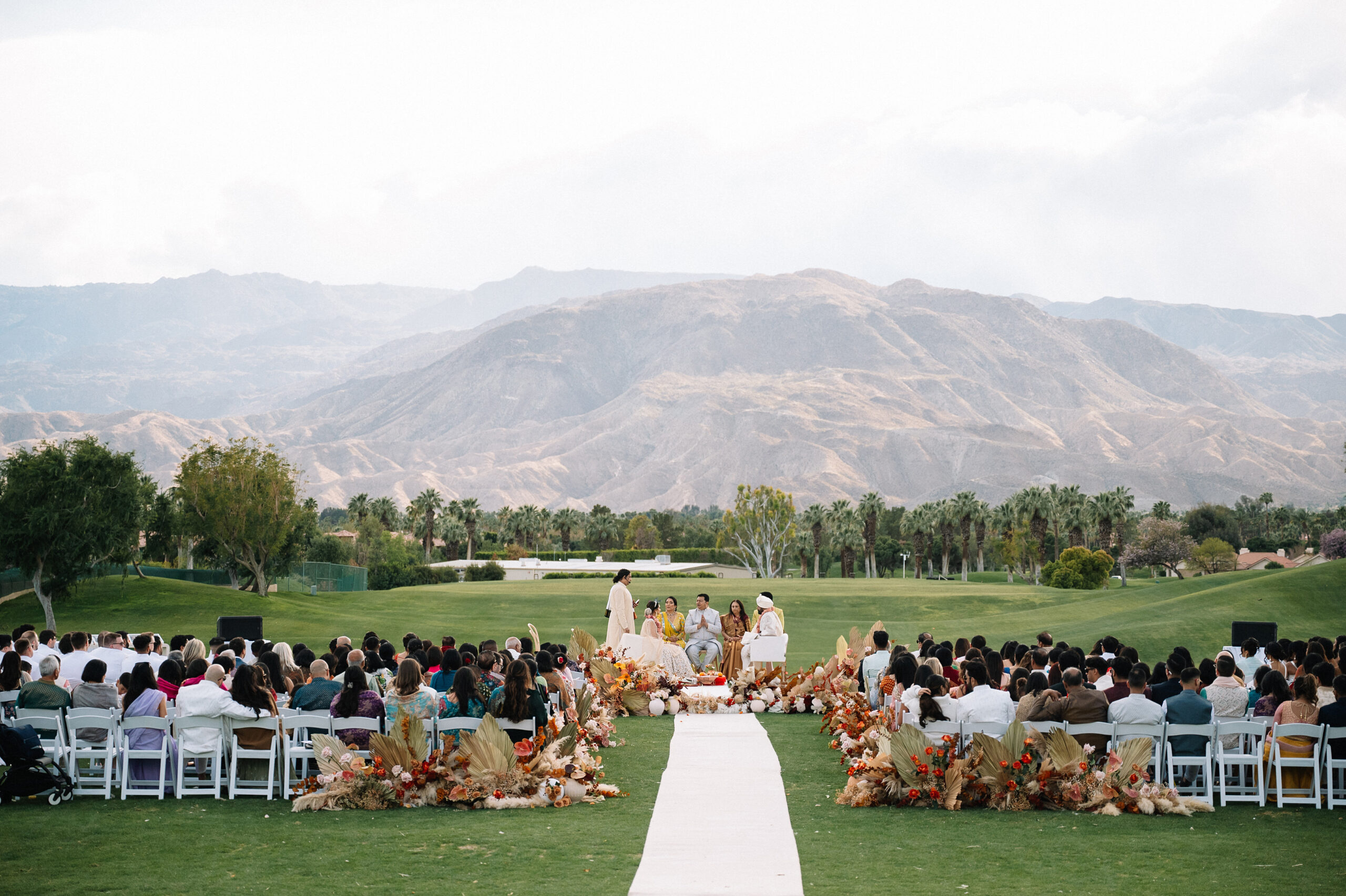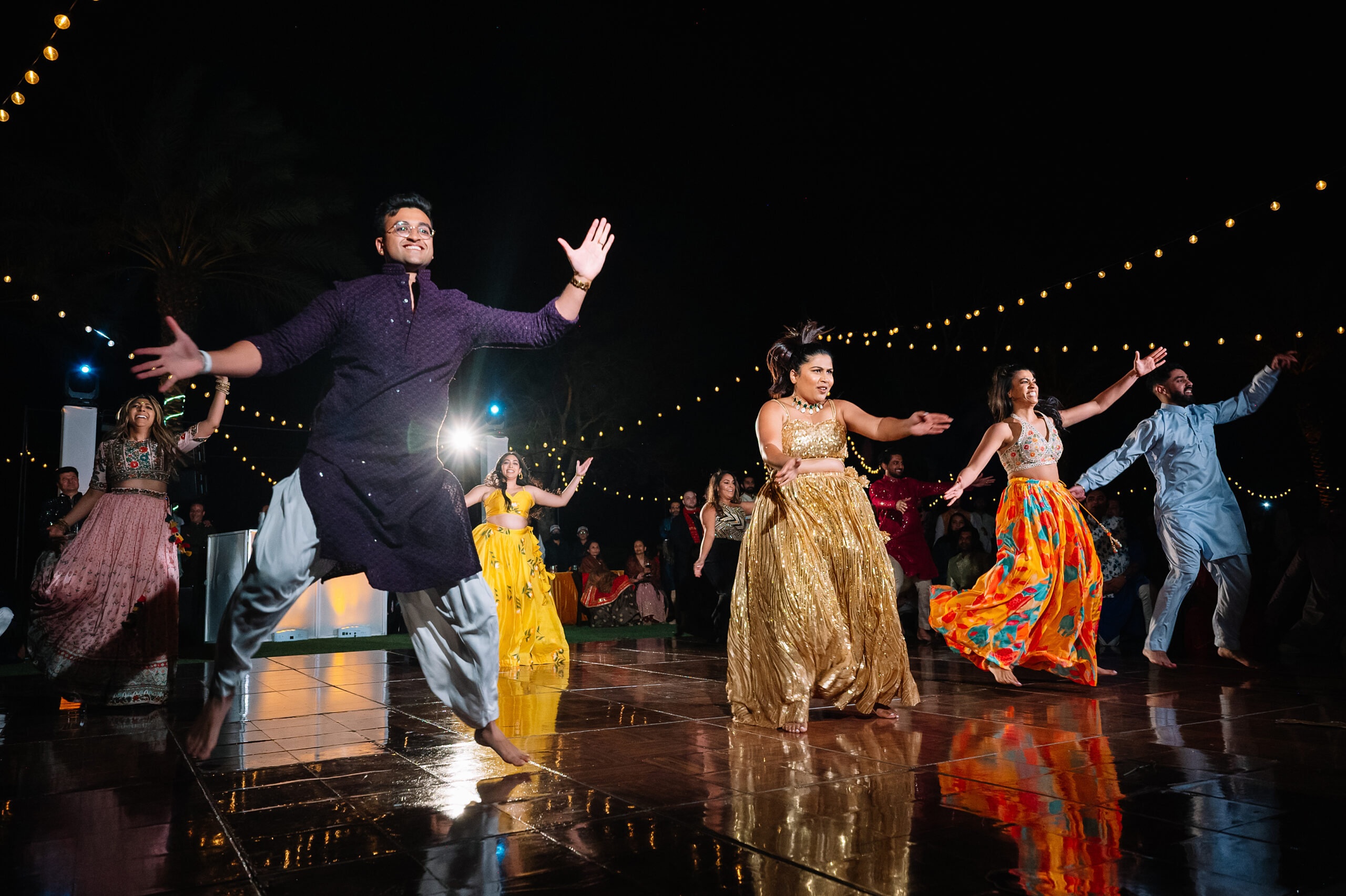 The Sangeet, a prewedding ceremony, featured a midnight in Marrakesh theme. With a palette of jewel tones, the East Lawn of Indian Wells Golf Resort colorfully popped with props such as Moroccan doors & pillows. Typically, the Sangeet Ceremony presents the two families with an opportunity to get to know one another better. Singing and dancing offer common interests to bridge the gap of the unknowns, allowing fertile ground for the union to flourish and prosper. But for Saagar, Janki, and their families, the need to get to know one another was not there. They have known each another for over two decades. Having met when she was only five years old, Janki remembers how nice it was to build a relationship on friendship prior to becoming Mr. & Mrs.