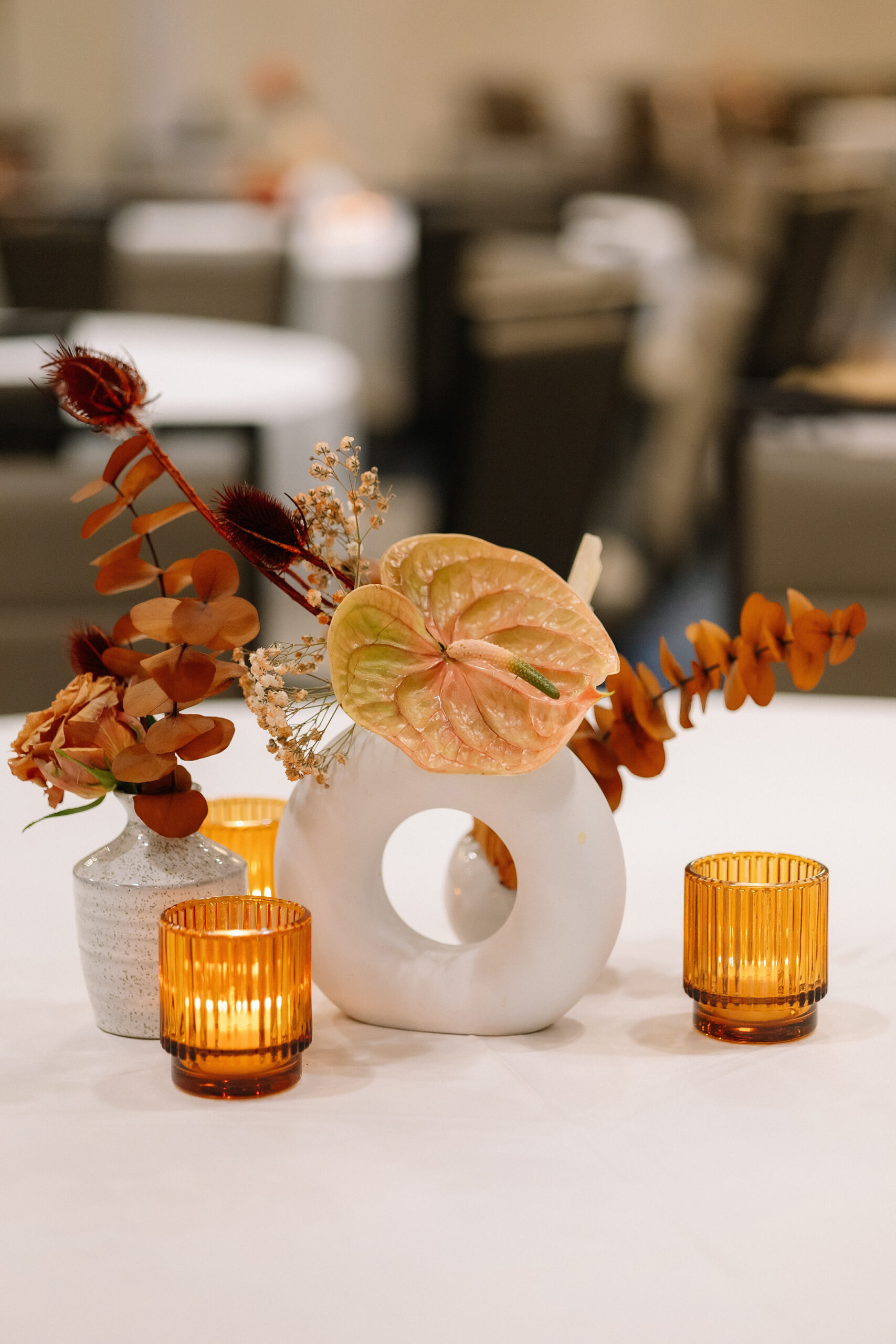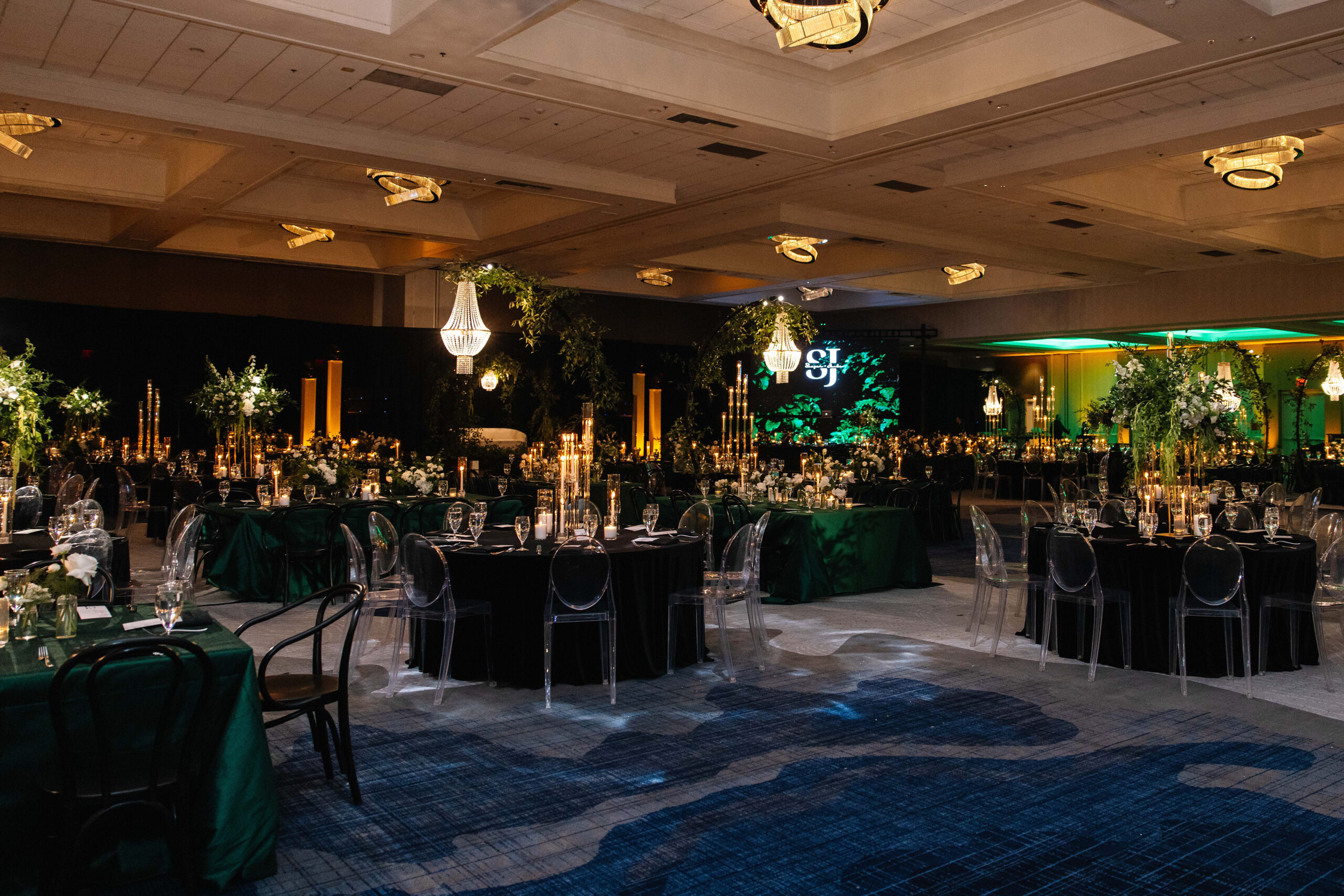 The reception took place on the Springs Terrace at JW. Emerald colors highlighted the luxurious architectural features of the property. Mirrors, chandeliers and lush greenery shimmered like a delicate fantasy. Elements of every table setting echoed ethereal grove. Its exquisite beauty was only matched by the bride’s bustier gown by For Love & Lemons.