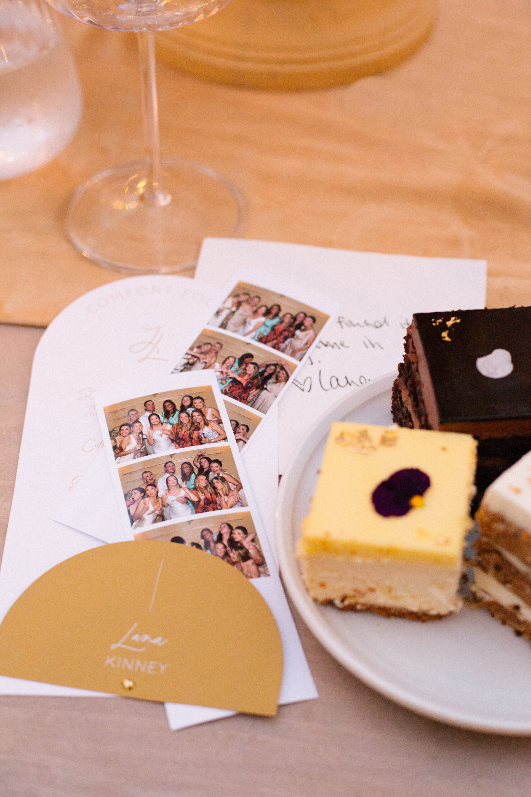 Unique features they incorporated in their wedding decor were “small bee moments” like honeycomb and wax candlelight to allude to meeting on Bumble. They even gave their guests “a little buzz” with a champagne escort wall that later turned into a photo booth. The couple also designed custom cocktail napkins on Etsy featuring their own handwritten messages to each other. Lana did a brother sister dance, in addition to her father daughter dance.