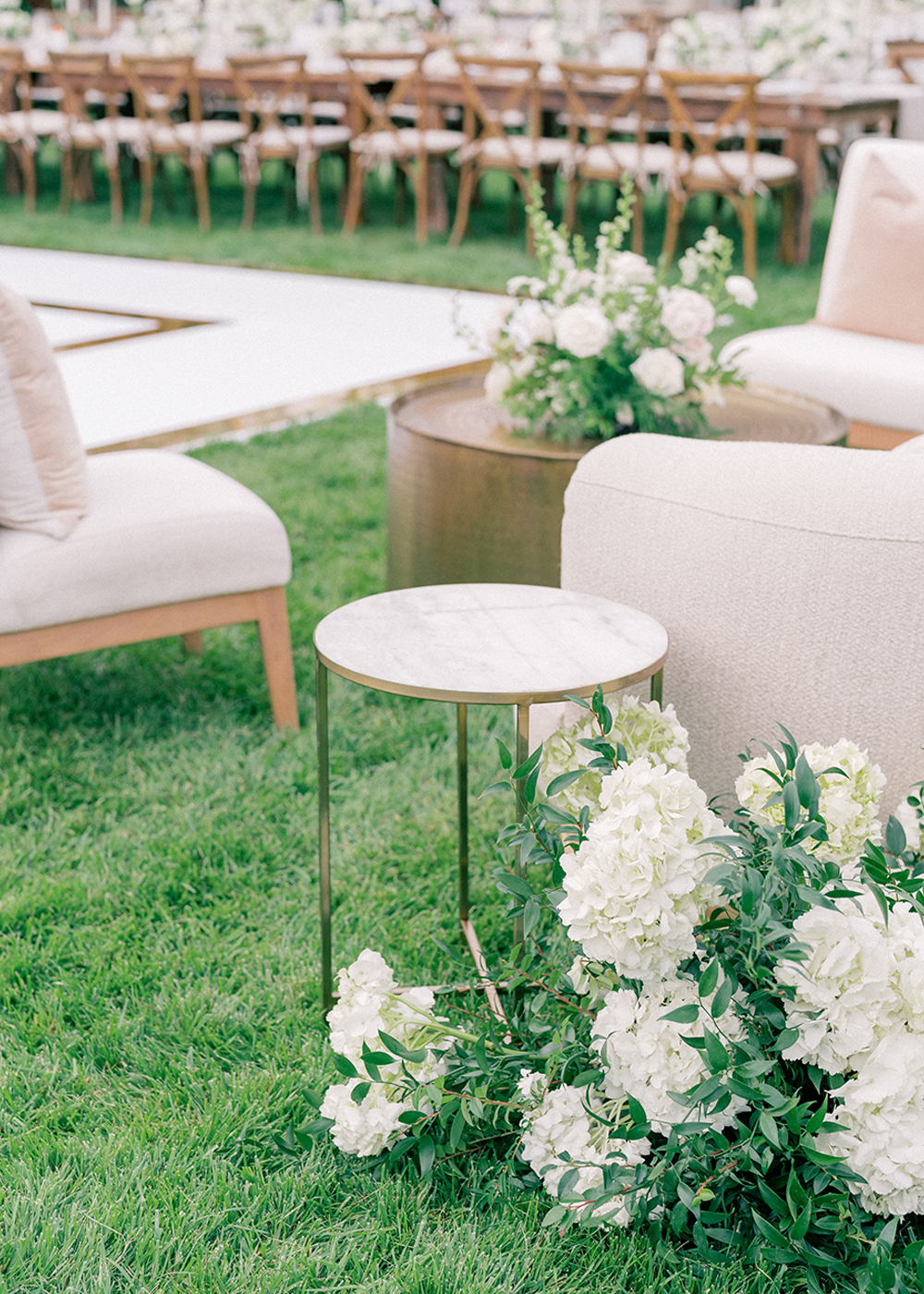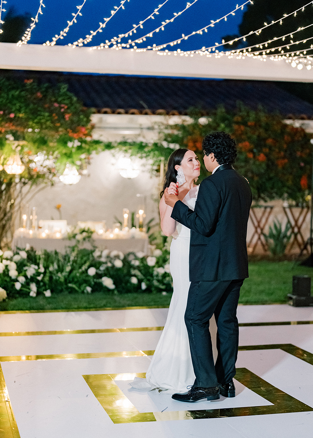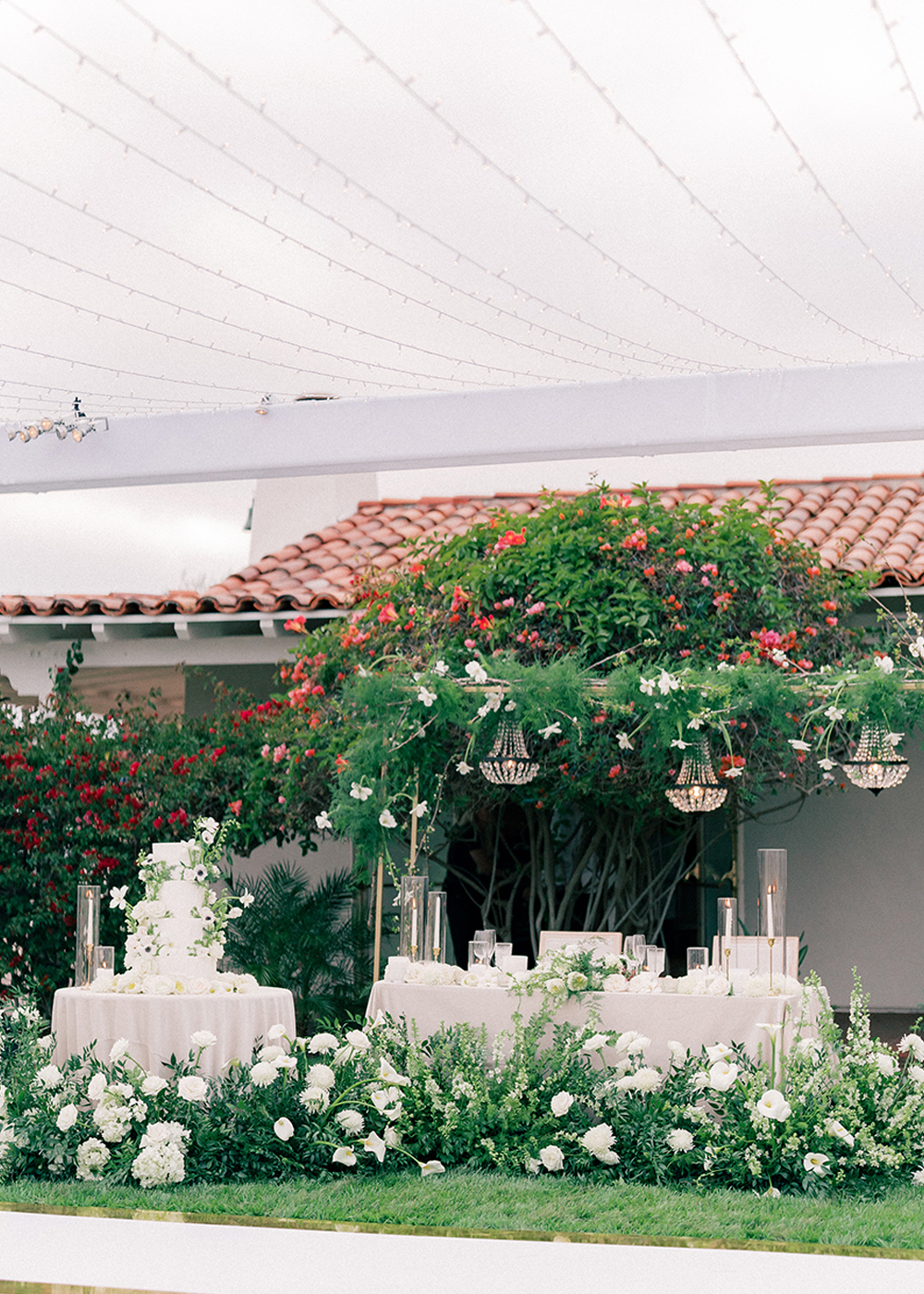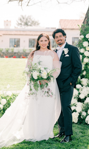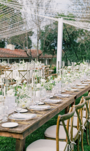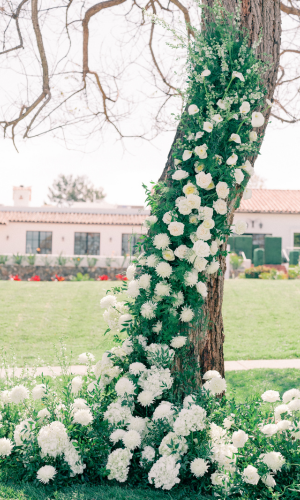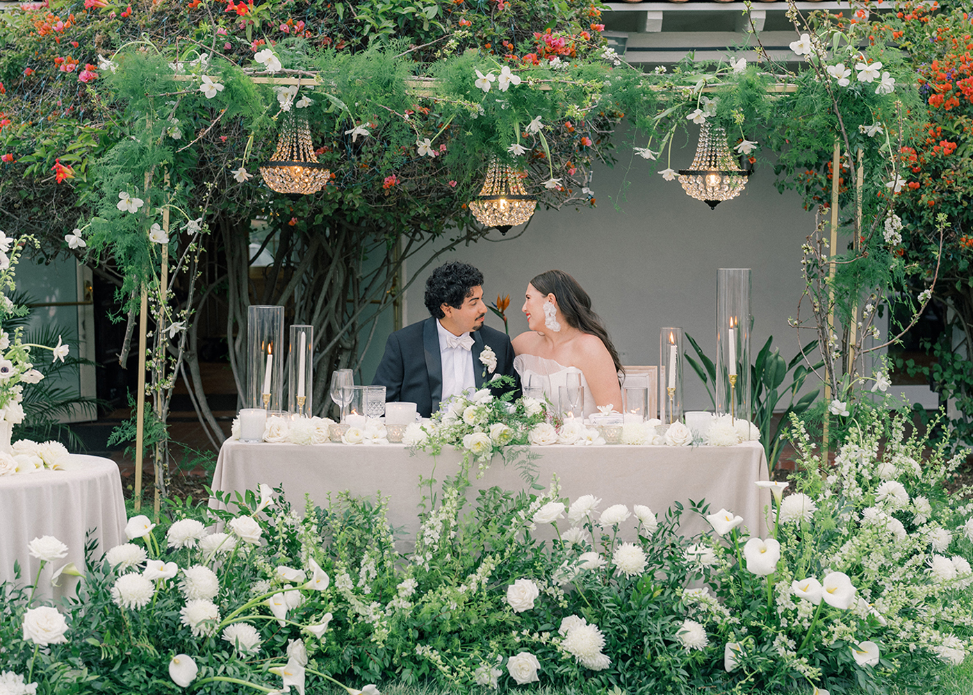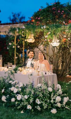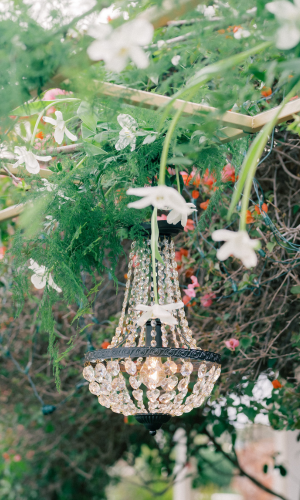 The couple desired a wedding celebration that reflected their love story—romantic, classic, elegant, and everlasting. Imagine a whimsical wedding of white florals and greens, cascading crystal lanterns, and twinkling lights under a starlit sky. Adjacent to an enchanted tree, beautifully situated in the center of lush and fragrant gardens, is where the ceremony was held. A corridor of white florals graced the edge of the walkway that led to the tree and enveloped the trunk, as if to say they had been flourishing there forever. Grace wore an exquisite white gown that flowed and even glistened in the sun’s light as she walked toward her groom. Alex was quite dashing in his classic black suit as he awaited his soon-to-be bride.