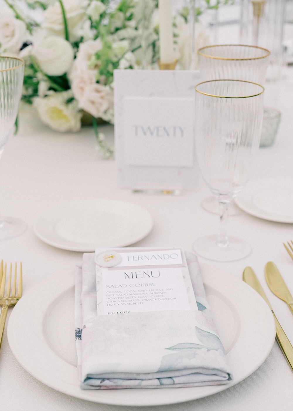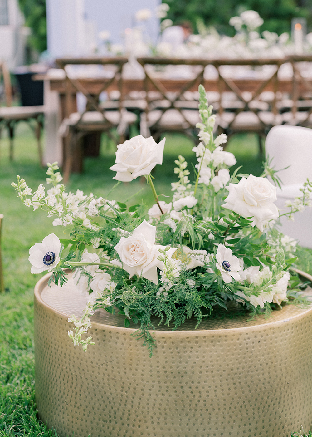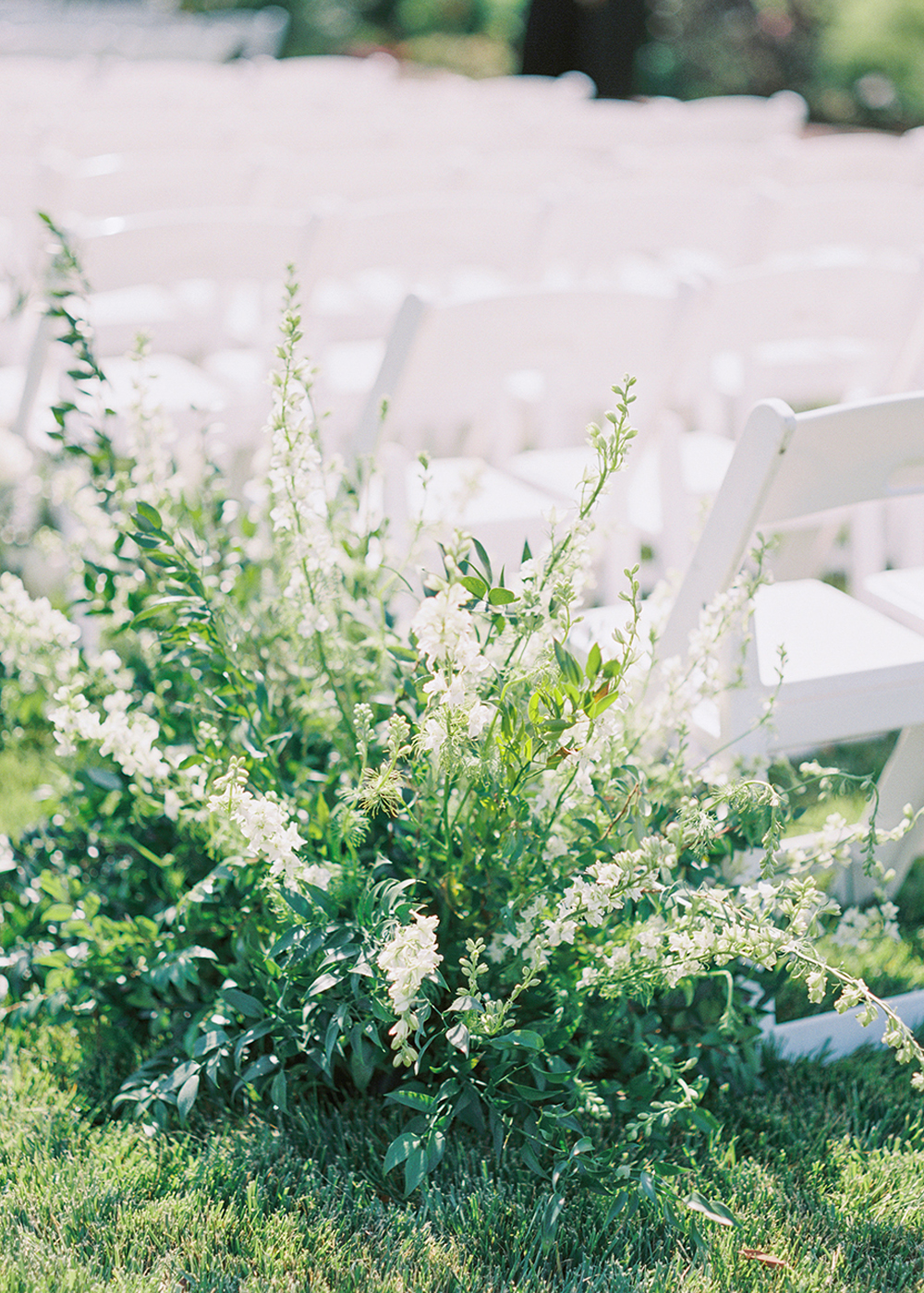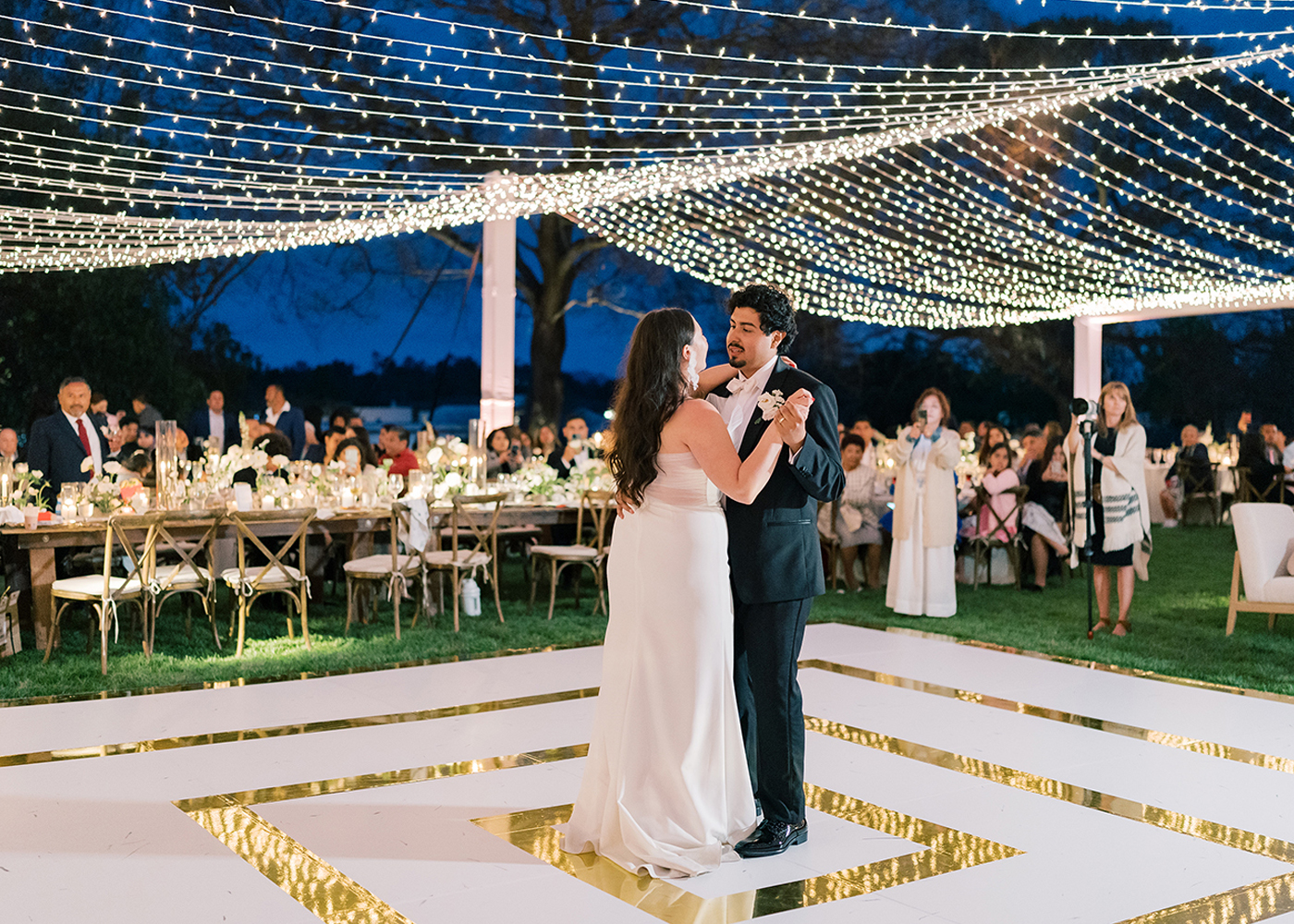 The couple desired a wedding celebration that reflected their love story—romantic, classic, elegant, and everlasting. Imagine a whimsical wedding of white florals and greens, cascading crystal lanterns, and twinkling lights under a starlit sky. Adjacent to an enchanted tree, beautifully situated in the center of lush and fragrant gardens, is where the ceremony was held. A corridor of white florals graced the edge of the walkway that led to the tree and enveloped the trunk, as if to say they had been flourishing there forever. Grace wore an exquisite white gown that flowed and even glistened in the sun’s light as she walked toward her groom. Alex was quite dashing in his classic black suit as he awaited his soon-to-be bride.