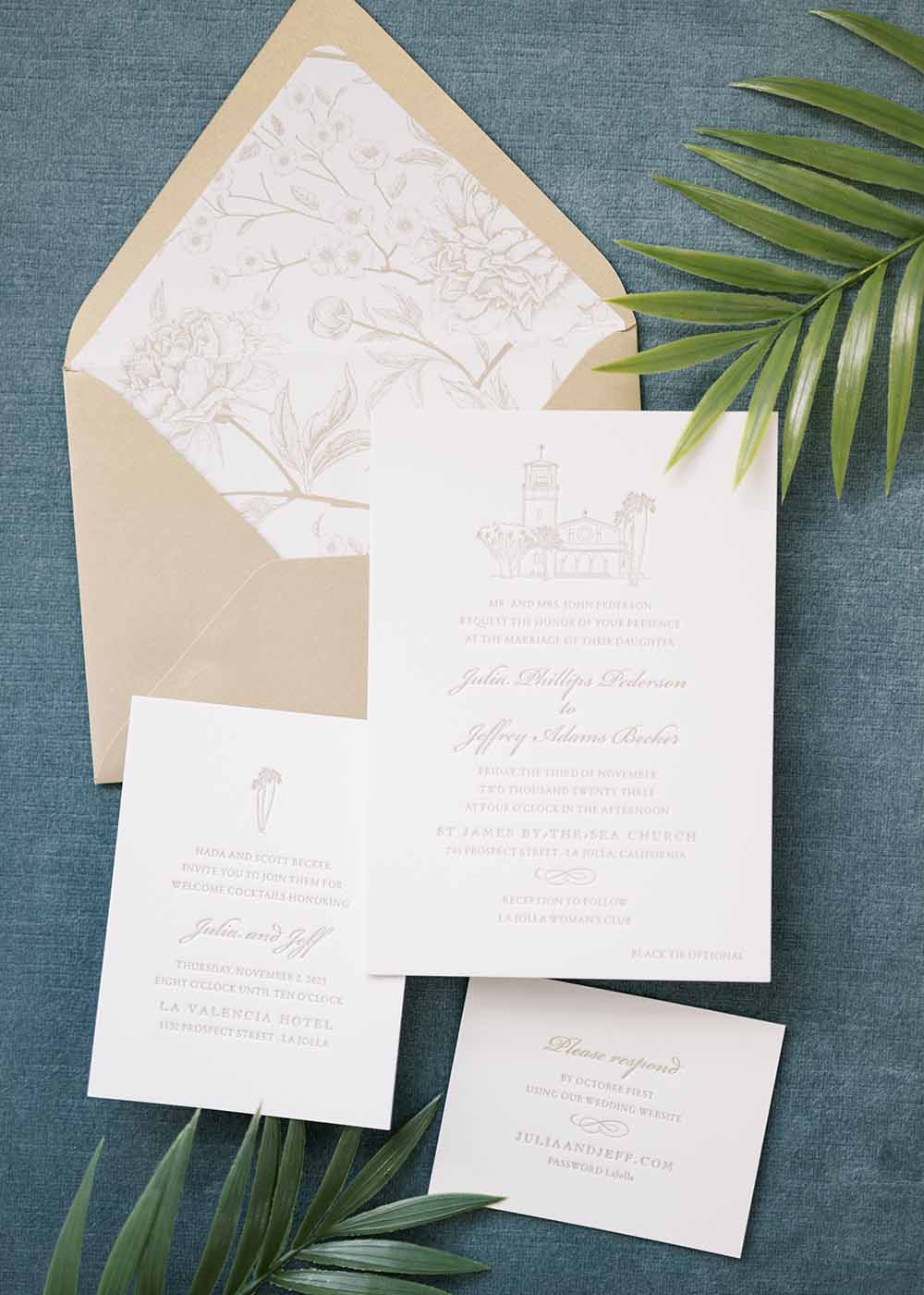 The wedding of Julia and Jeff was a celebration of love styled in a theme of quiet luxury. The breathtaking ceremony took place at St. James by-the-Sea Episcopal Church, followed by dinner and dancing at the historic La Jolla Woman’s Club.