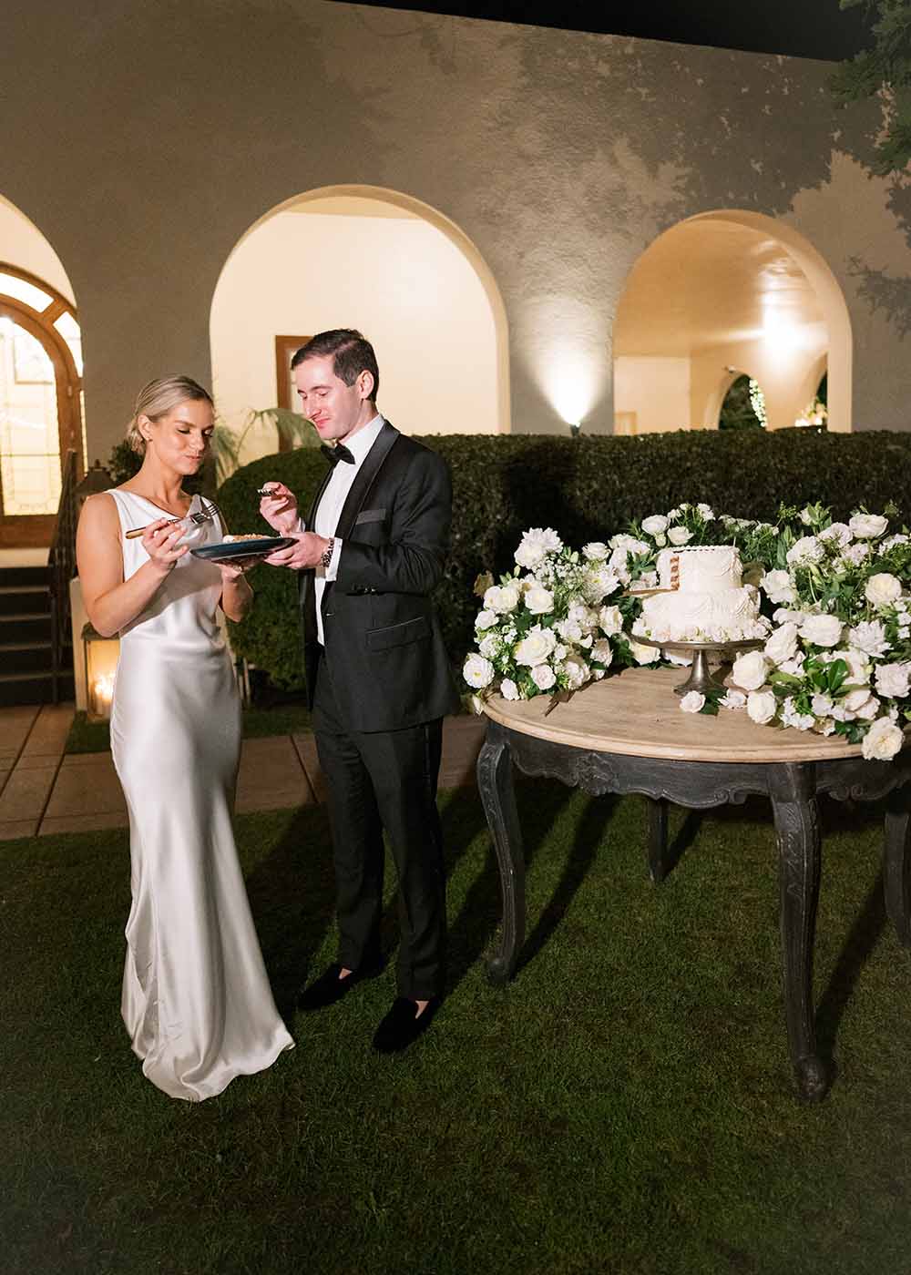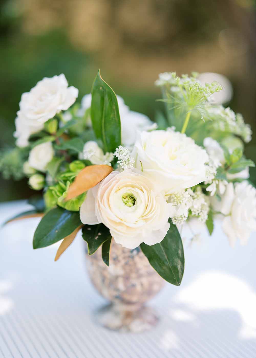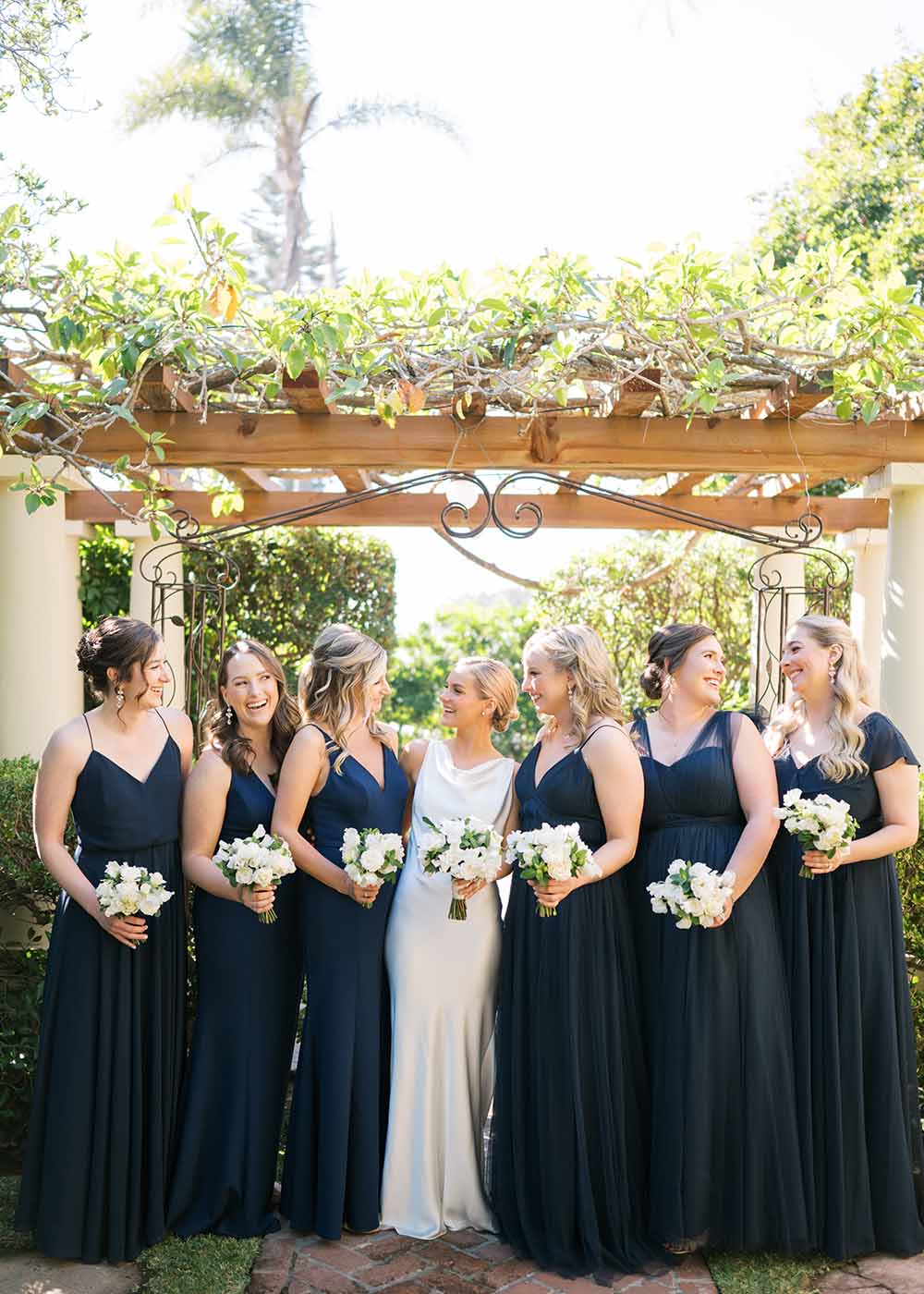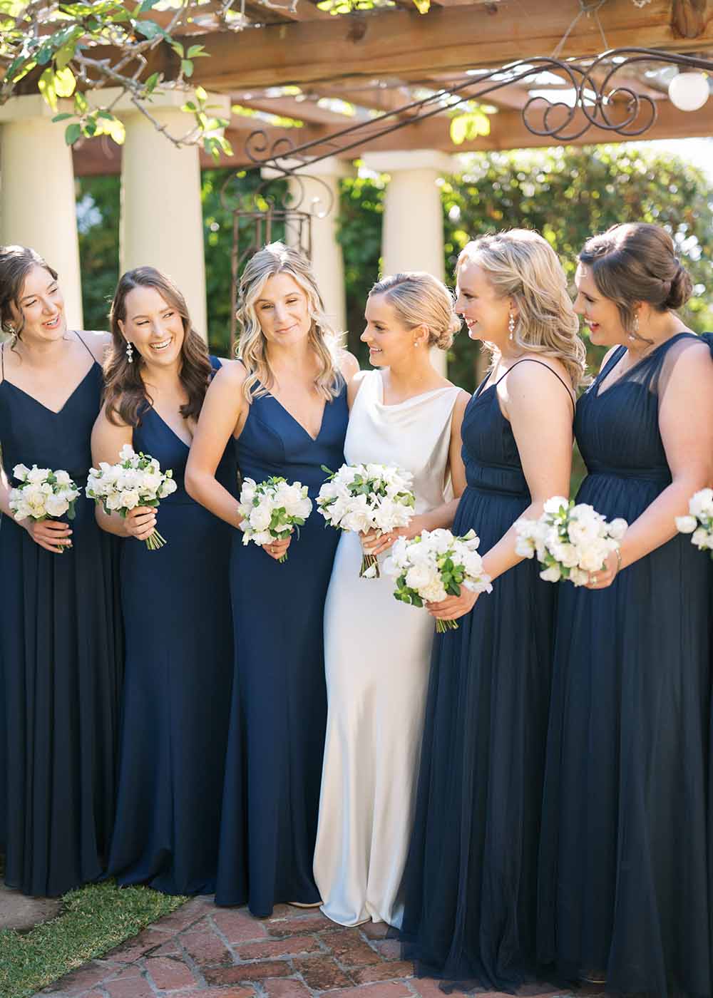 The attire set the tone. Julia wore an Alexandra Grecco gown fashioned with a stunning bateau neckline that harkened a feeling of timeless elegance. Her bridesmaids selected navy blue dresses by Jenny Yoo that were of varying but complementary style. Jeff and his groomsmen donned classic black tuxedos. The personal floral, created by the incomparable Annette Gomez Flowers, highlighted the look: a handheld bouquet of gardenia for the bride, and bouquets of white roses for the bridesmaids.