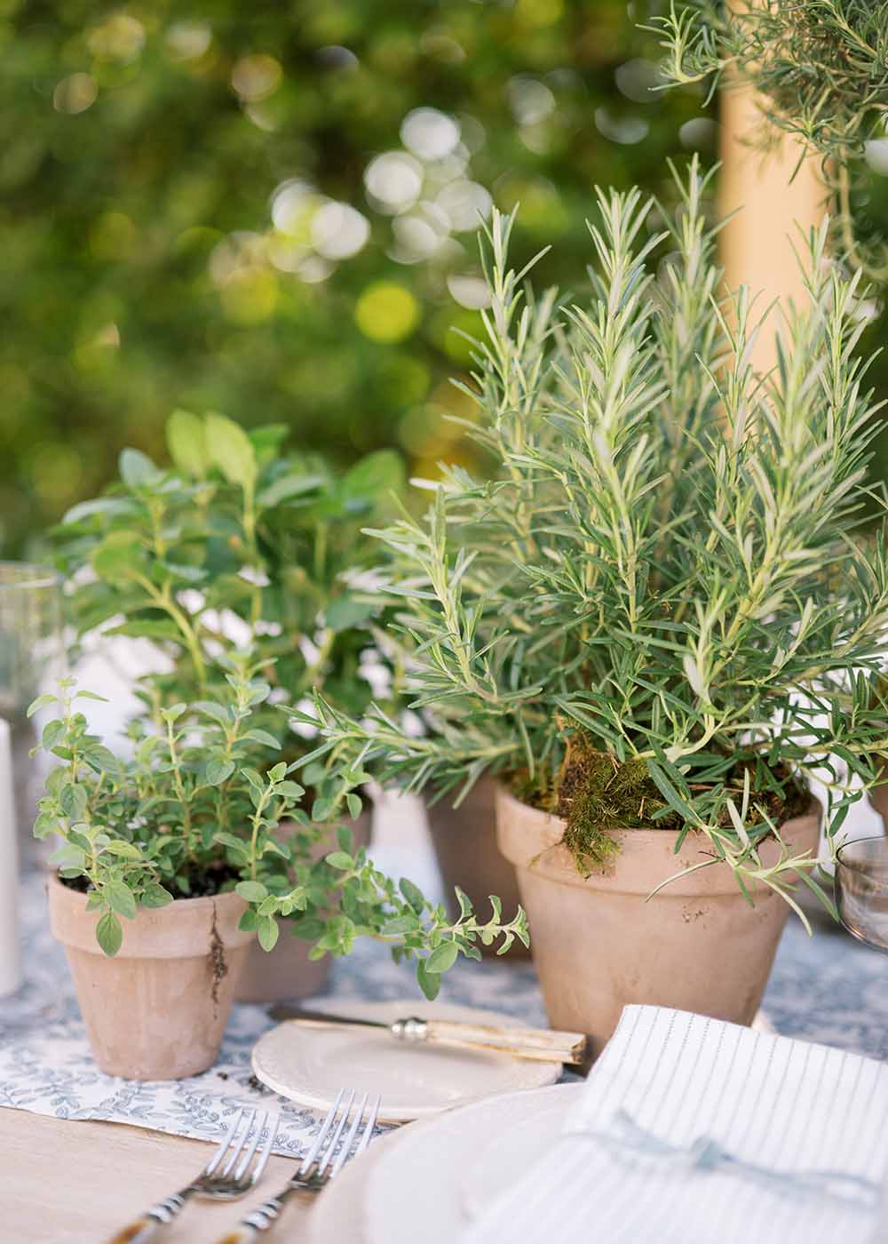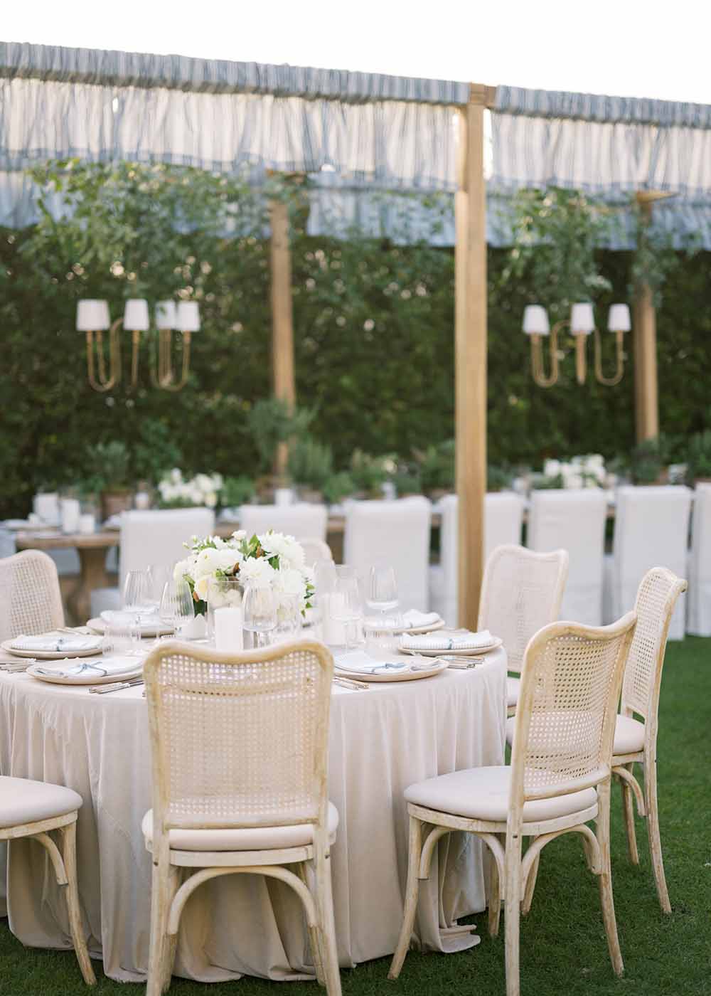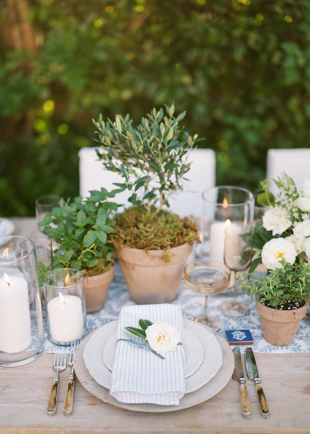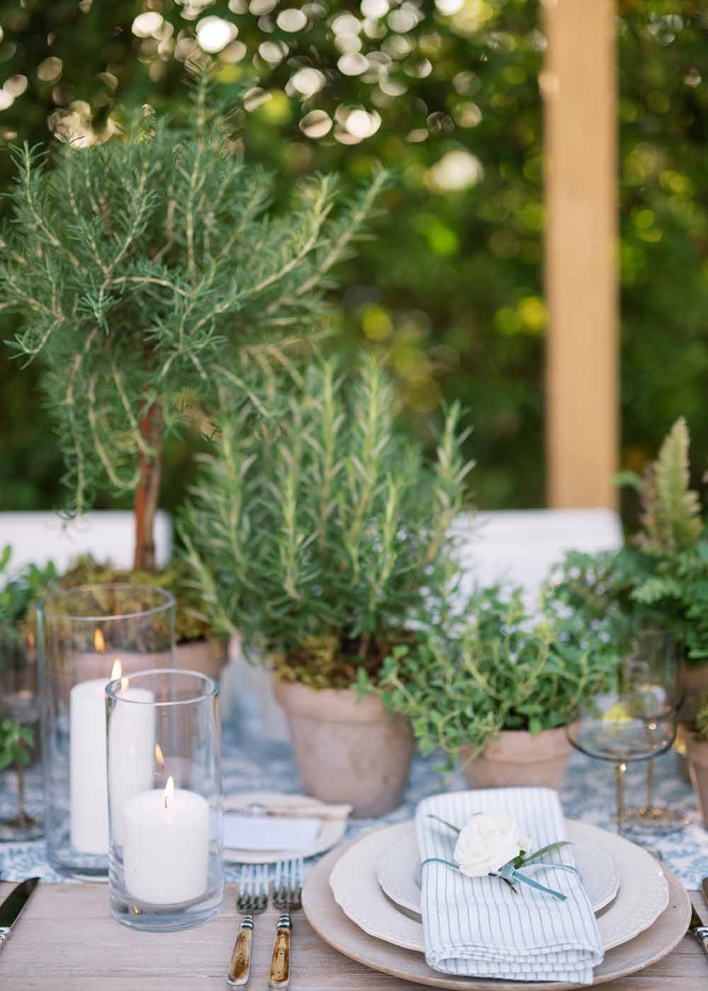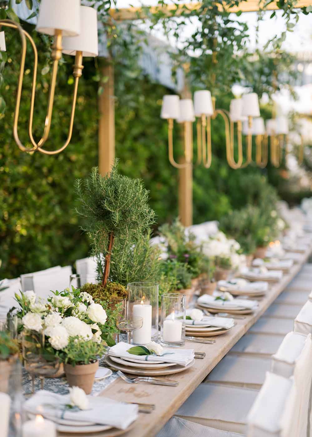 “Julia and Jeff wanted their reception to feel effortlessly refined. We wove approachable textures, like distressed wood and iron, with garden elements to create a space that was both humble and grand,” explained Heather Balliet. Guests were greeted at the cocktail hour with a playful display of escort cards tucked in garden soil. A wooden cabana with custom linen valances was built to frame the head dining table. Guest seating mixed both round and rectangular tables with wooden and wrought iron chairs to accentuate the garden atmosphere. Linens in bone velvet and a blue leaf pattern, punctuated by blue ticking stripe napkins, enhanced the style. Annette Gomez created centerpieces that incorporated arrangements of white garden roses, lily of the valley, sweet pea, and magnolia leaf with rustic pots filled with herbs that were repurposed to Julia’s home garden.