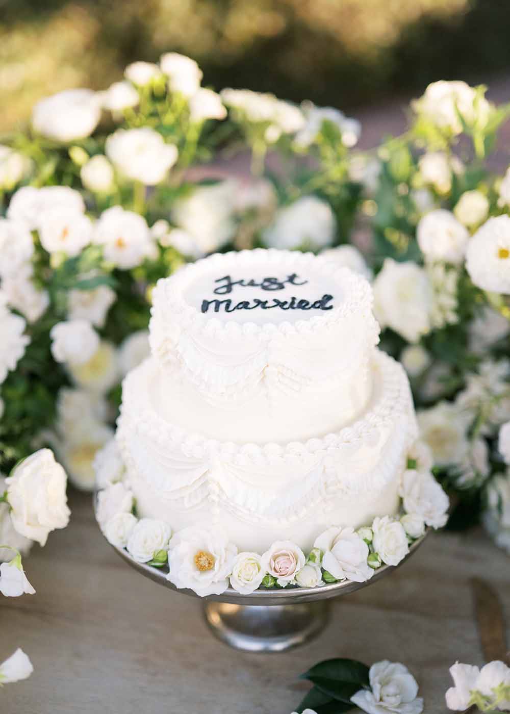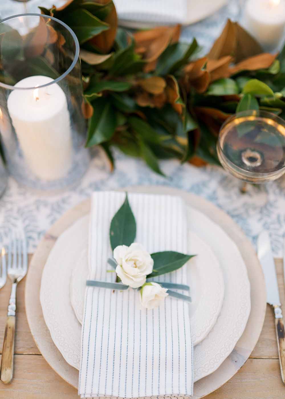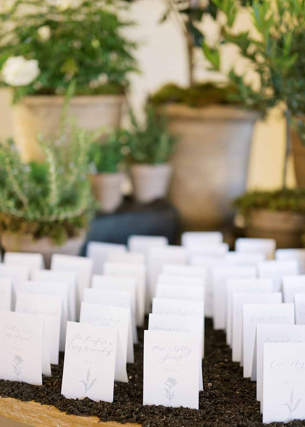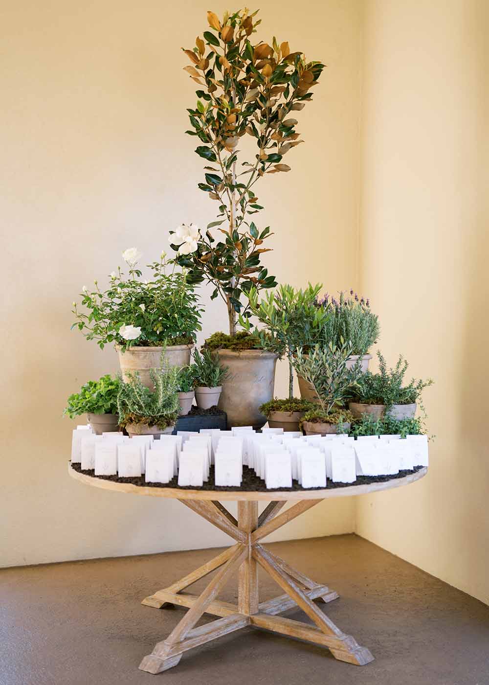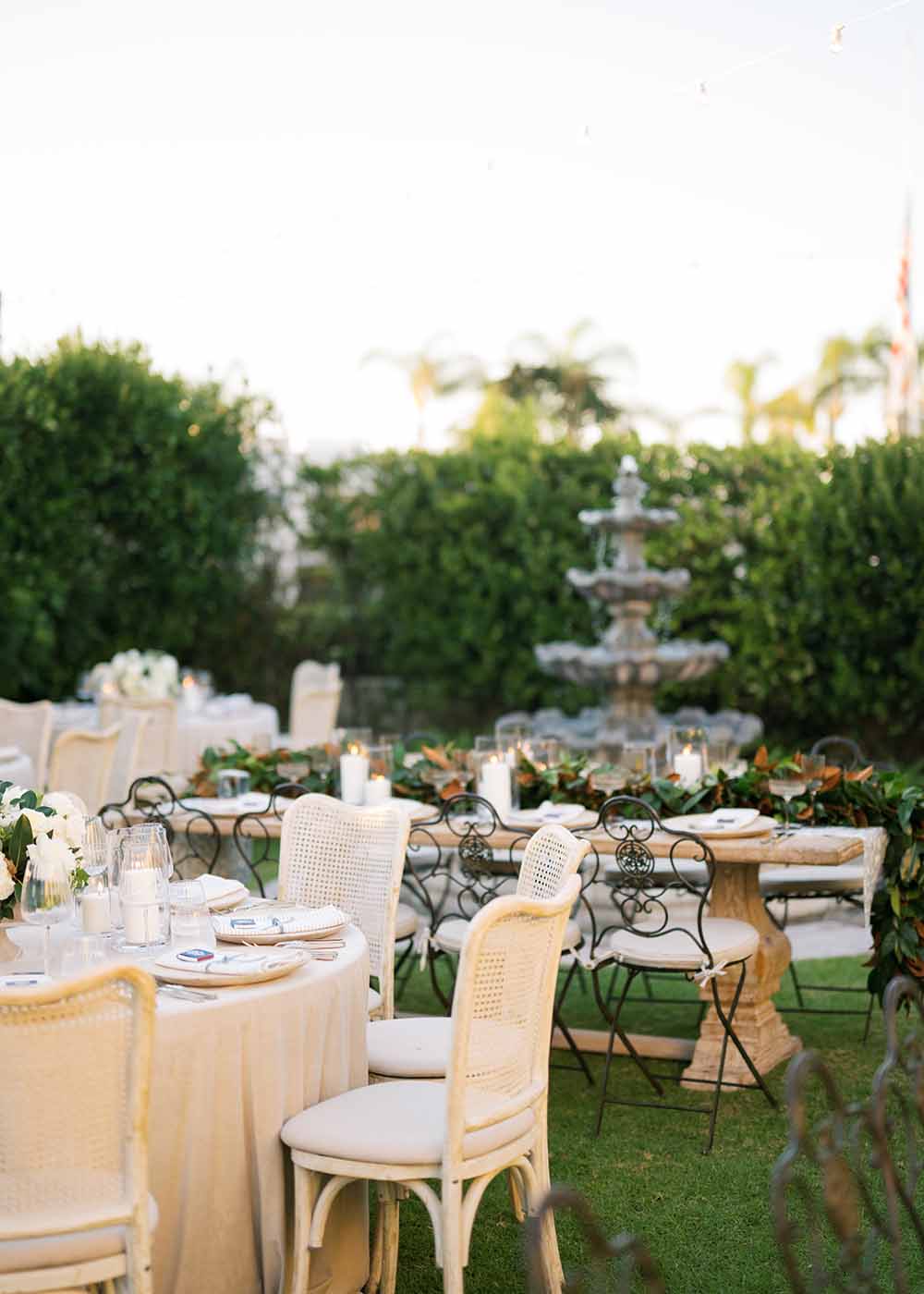 “Julia and Jeff wanted their reception to feel effortlessly refined. We wove approachable textures, like distressed wood and iron, with garden elements to create a space that was both humble and grand,” explained Heather Balliet. Guests were greeted at the cocktail hour with a playful display of escort cards tucked in garden soil. A wooden cabana with custom linen valances was built to frame the head dining table. Guest seating mixed both round and rectangular tables with wooden and wrought iron chairs to accentuate the garden atmosphere. Linens in bone velvet and a blue leaf pattern, punctuated by blue ticking stripe napkins, enhanced the style. Annette Gomez created centerpieces that incorporated arrangements of white garden roses, lily of the valley, sweet pea, and magnolia leaf with rustic pots filled with herbs that were repurposed to Julia’s home garden.