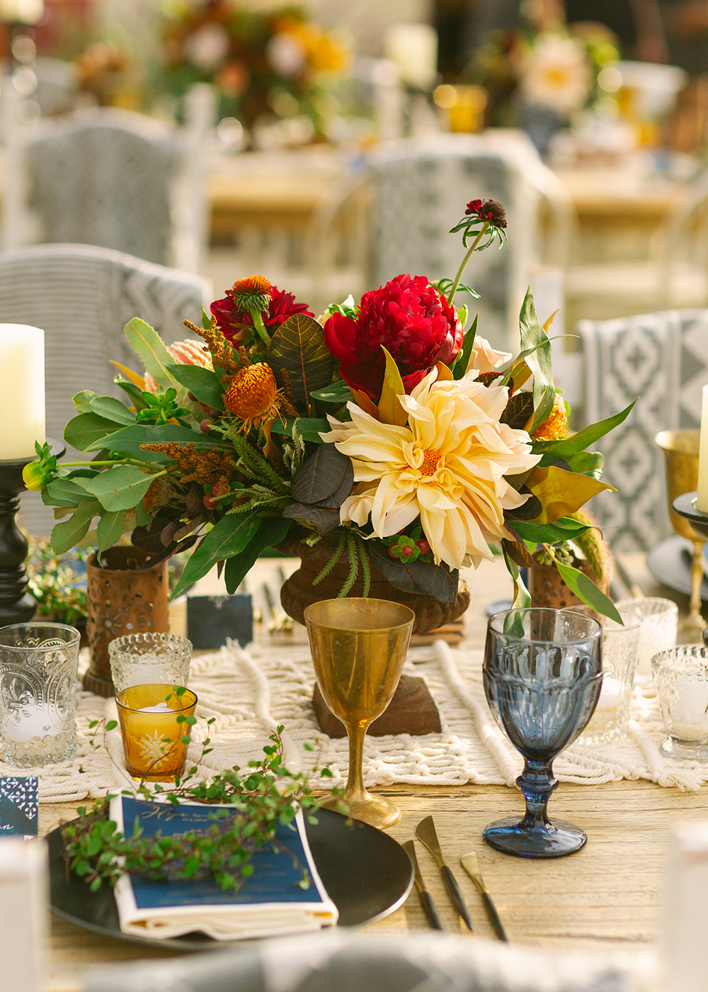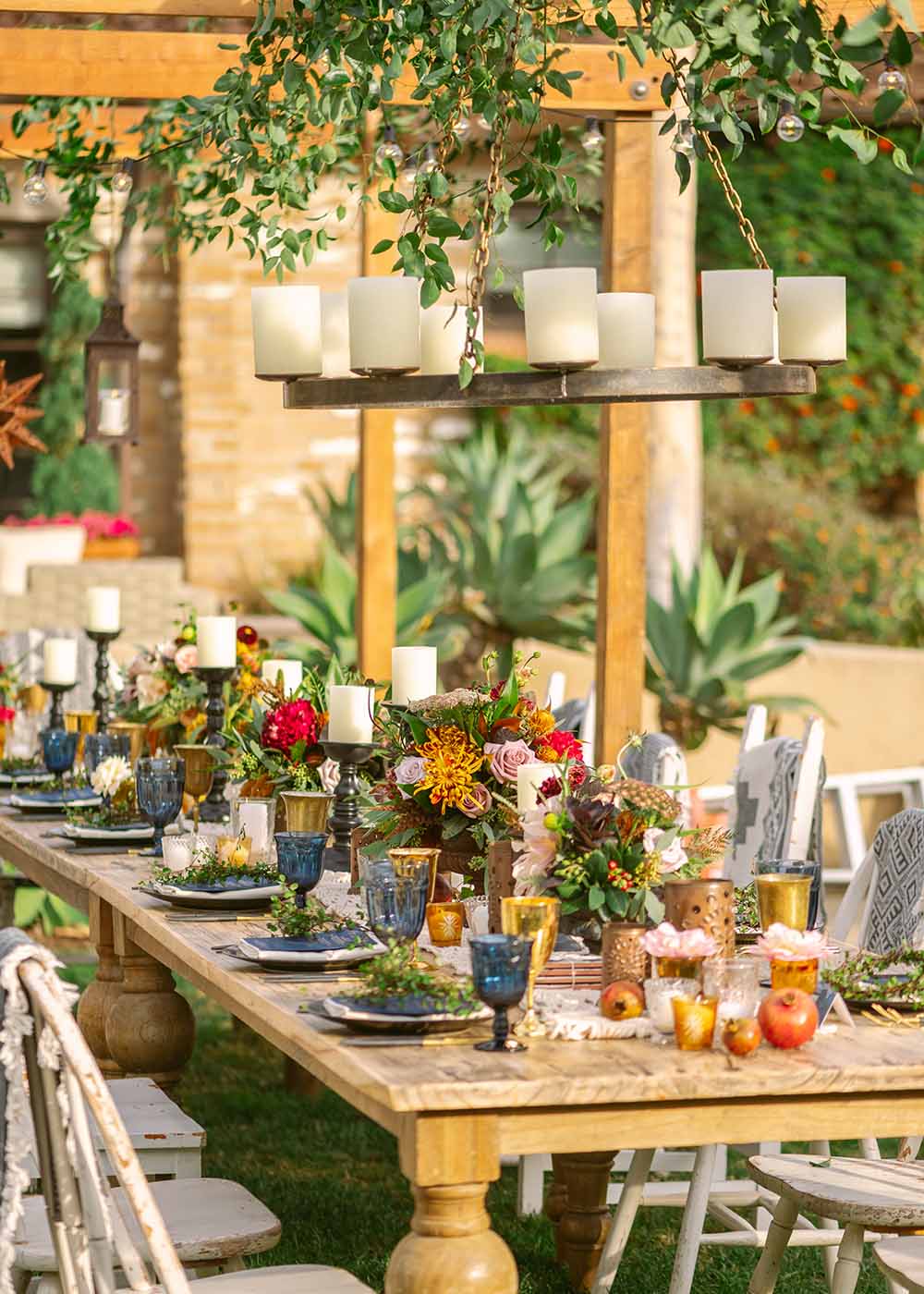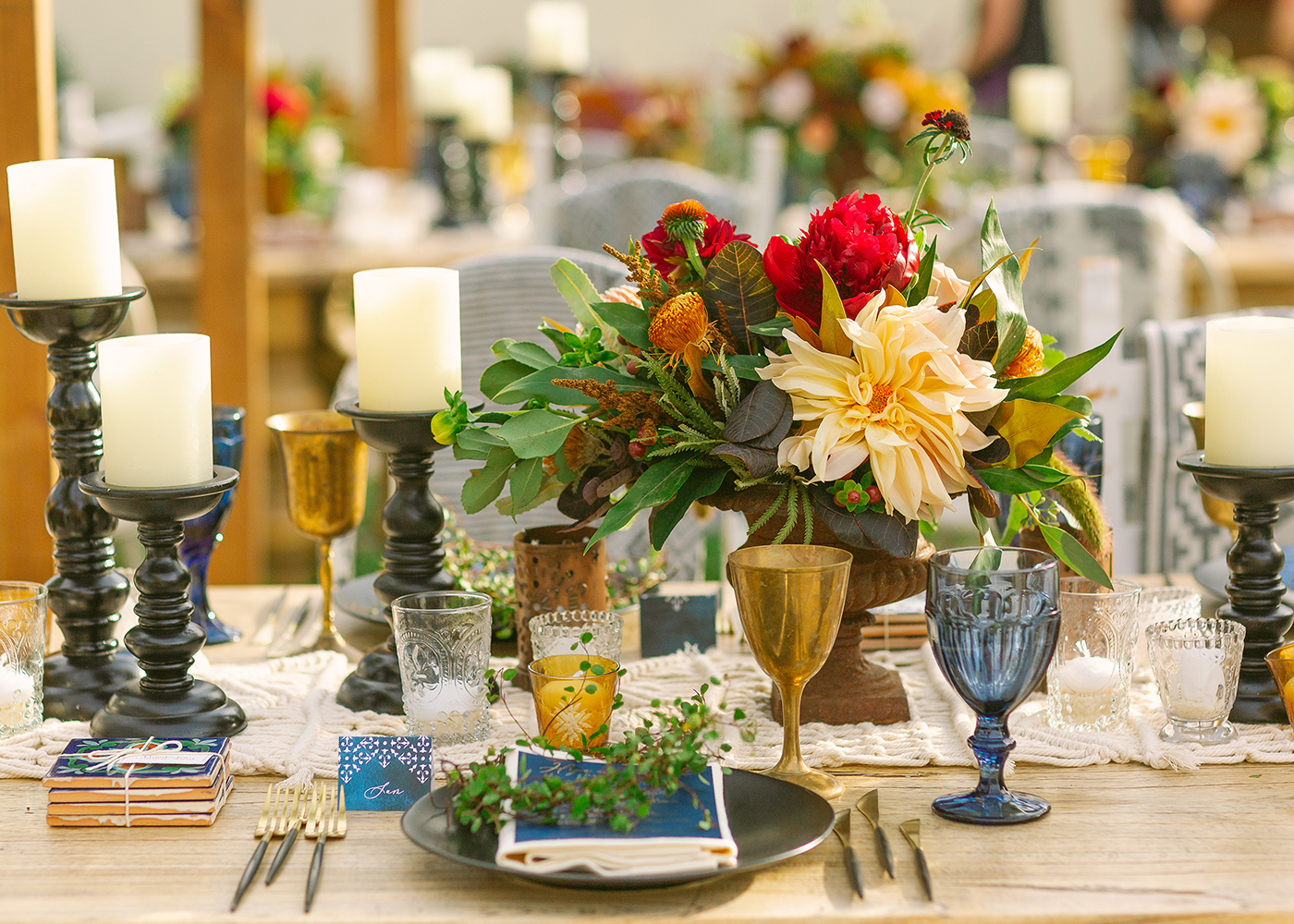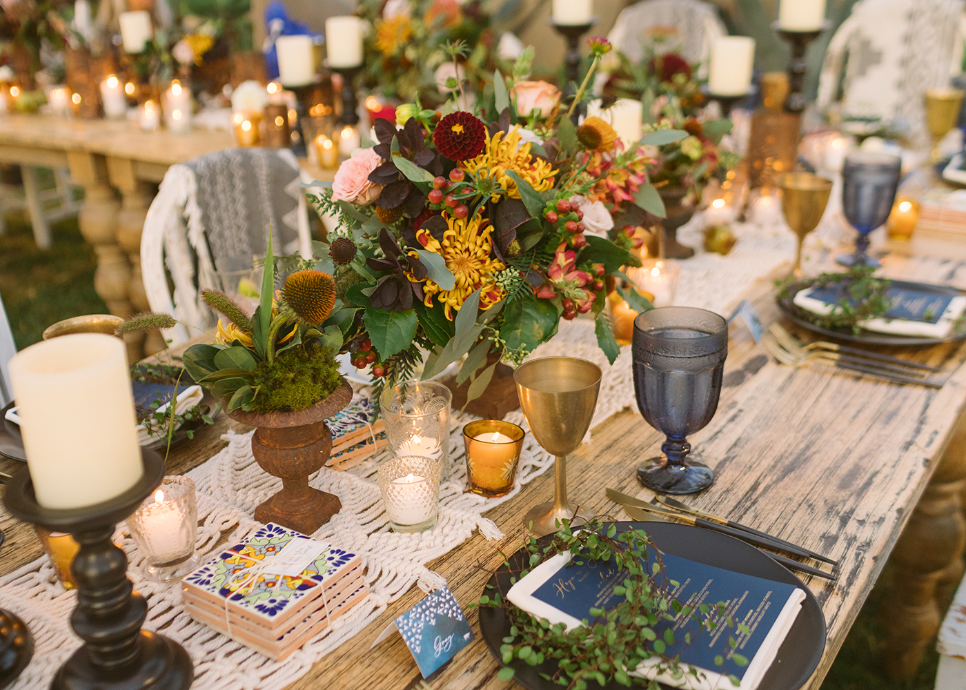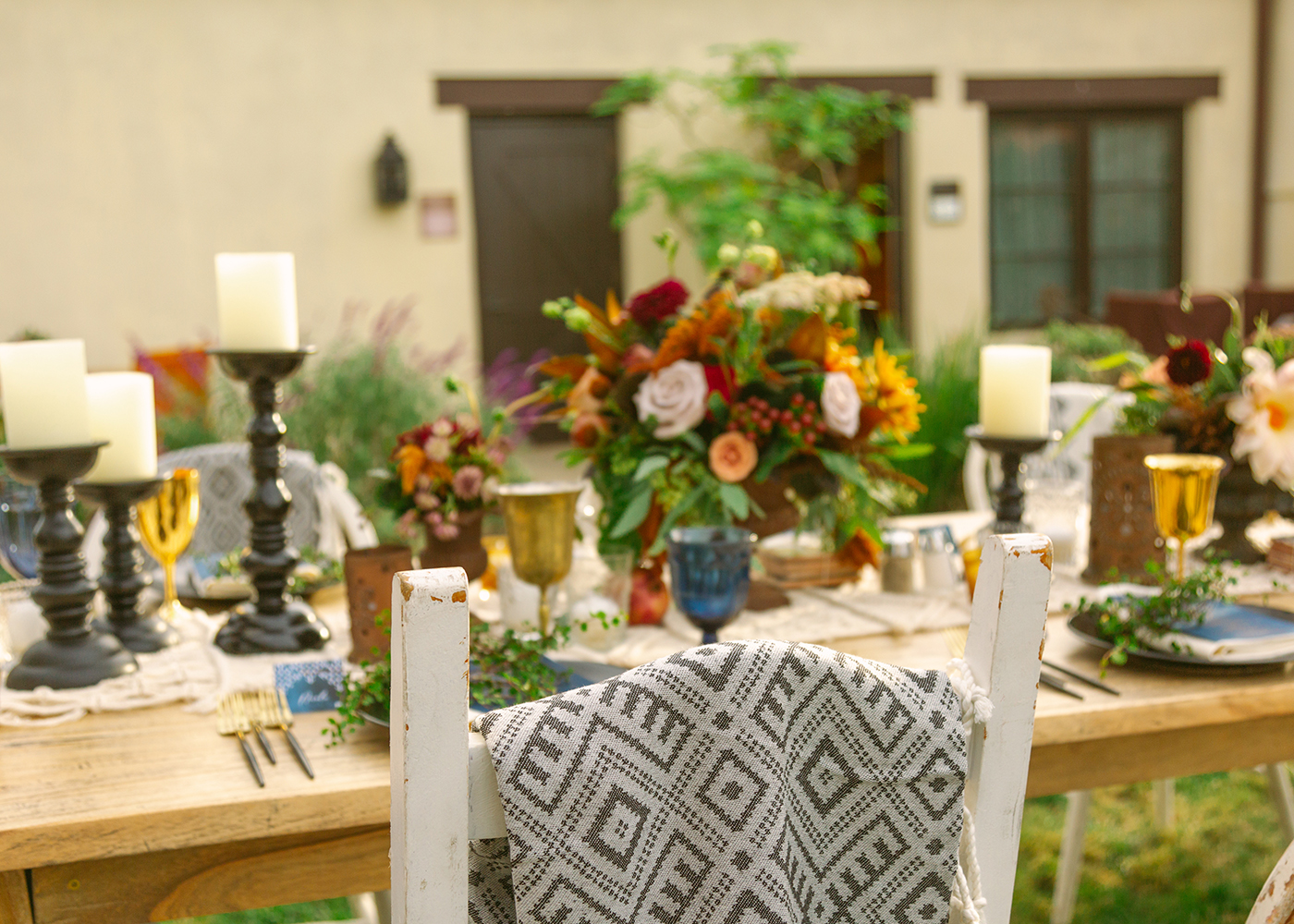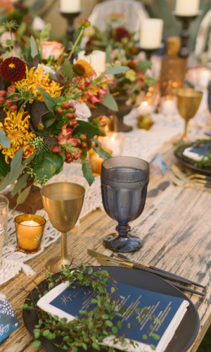 Ivy wreaths and fall florals in hues of peach, ruby and buttery yellow adorned tabletops; midnight blue and gold accents were echoed in sapphire and gold glassware and cutlery; patterned textiles draped over the backs of chairs provided texture; and candles, staggered in height, illuminated the lavish table scape from below, while Moroccan lanterns cast a lacy light from above.