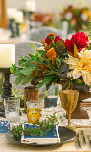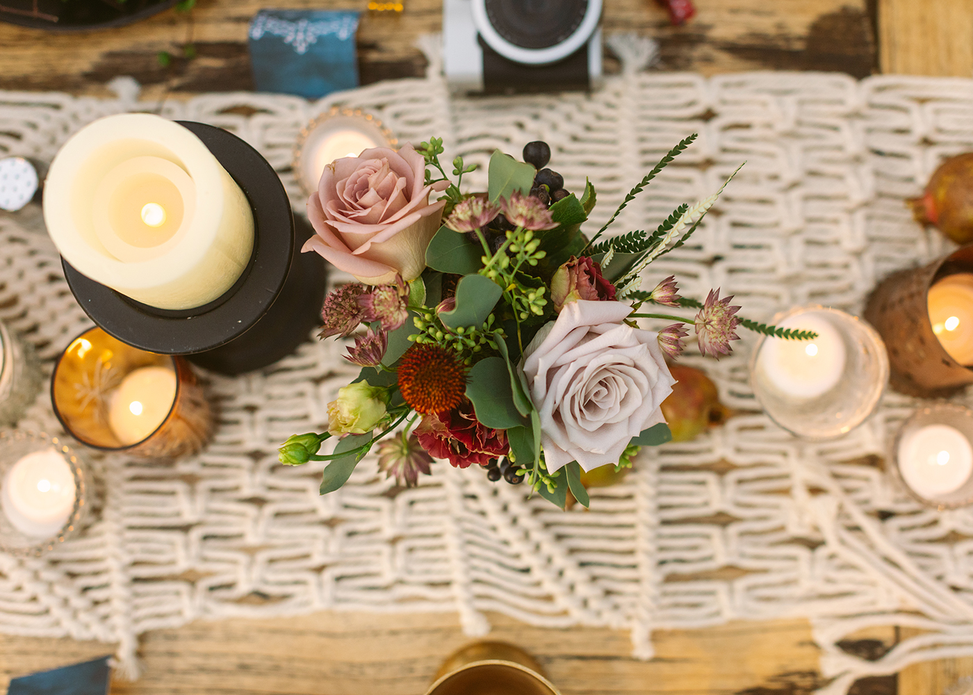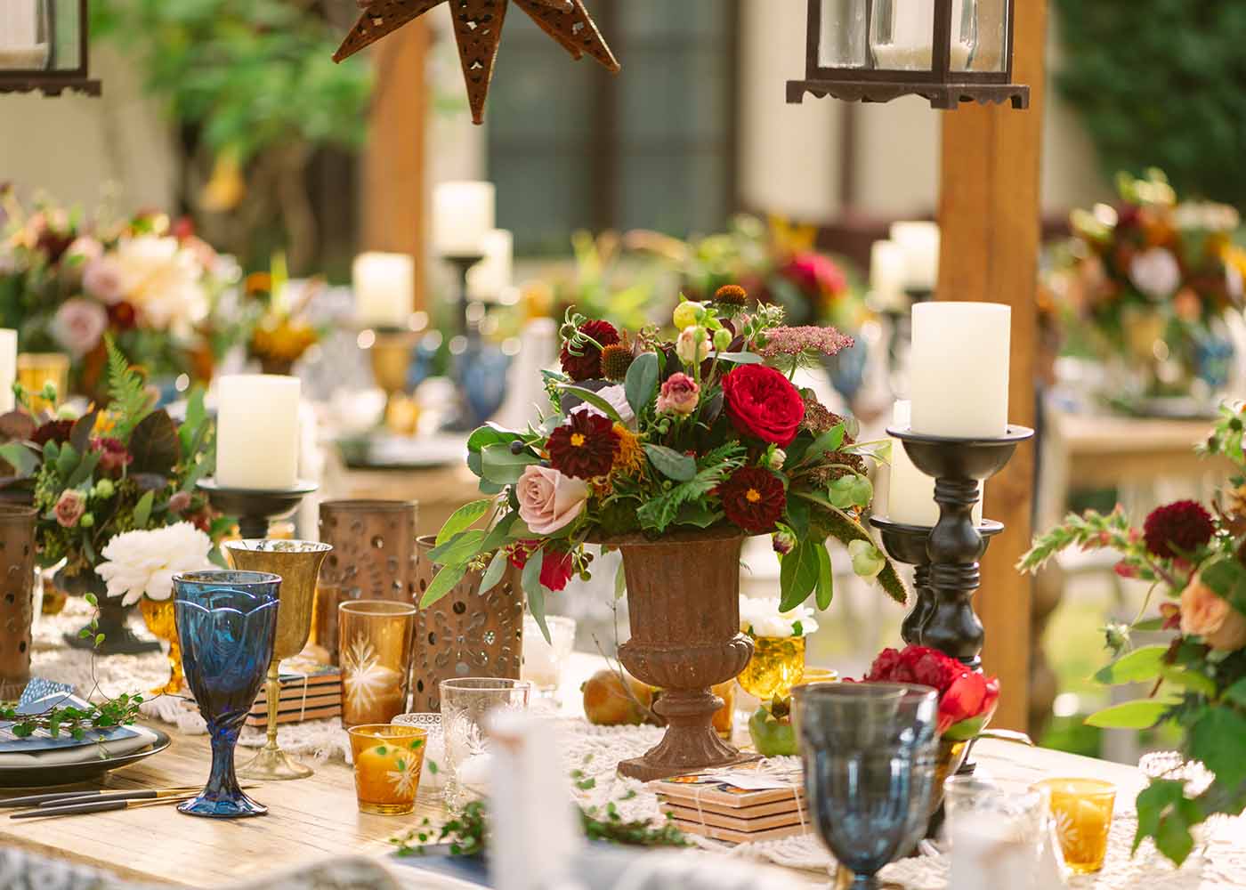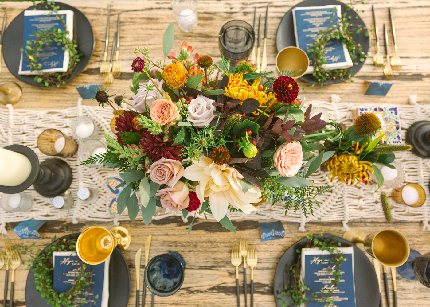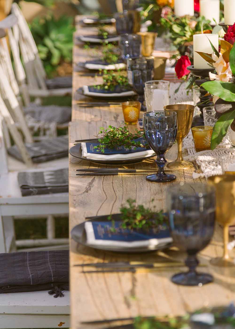 Ivy wreaths and fall florals in hues of peach, ruby and buttery yellow adorned tabletops; midnight blue and gold accents were echoed in sapphire and gold glassware and cutlery; patterned textiles draped over the backs of chairs provided texture; and candles, staggered in height, illuminated the lavish table scape from below, while Moroccan lanterns cast a lacy light from above.