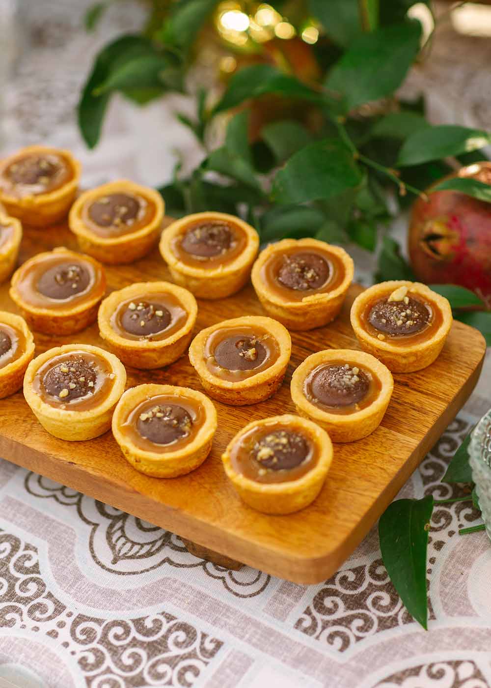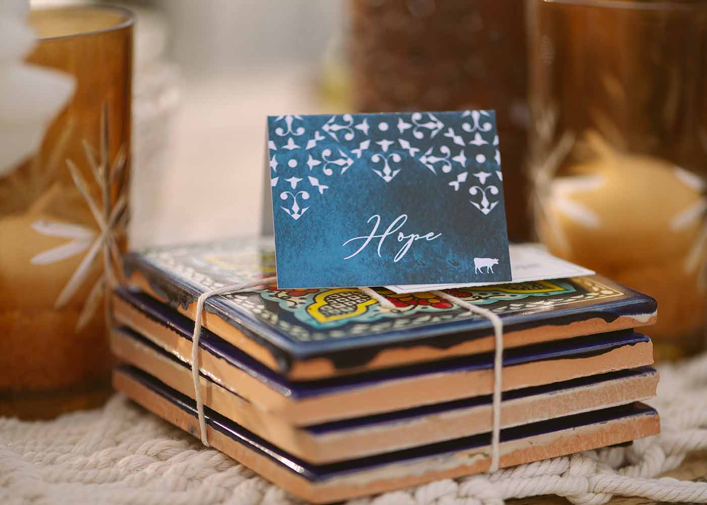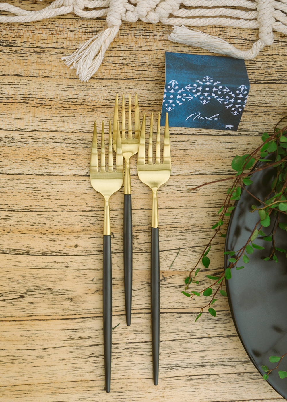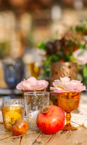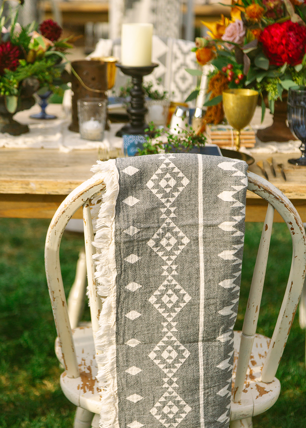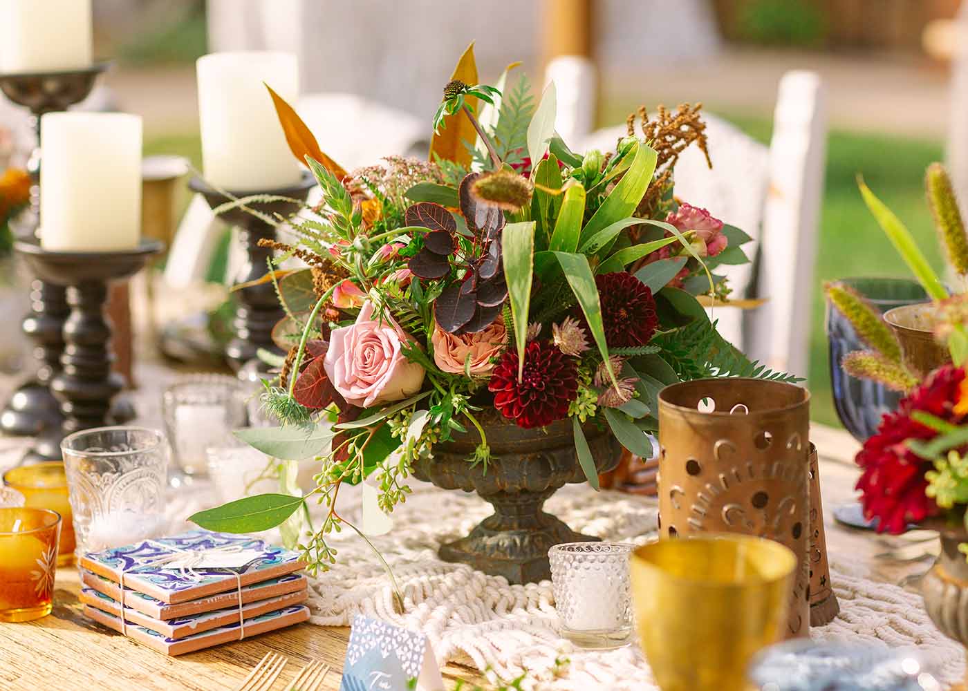 Ivy wreaths and fall florals in hues of peach, ruby and buttery yellow adorned tabletops; midnight blue and gold accents were echoed in sapphire and gold glassware and cutlery; patterned textiles draped over the backs of chairs provided texture; and candles, staggered in height, illuminated the lavish table scape from below, while Moroccan lanterns cast a lacy light from above.
