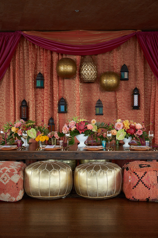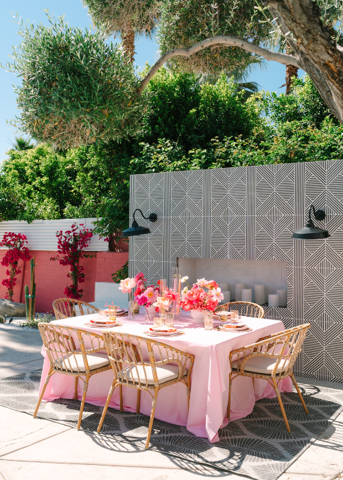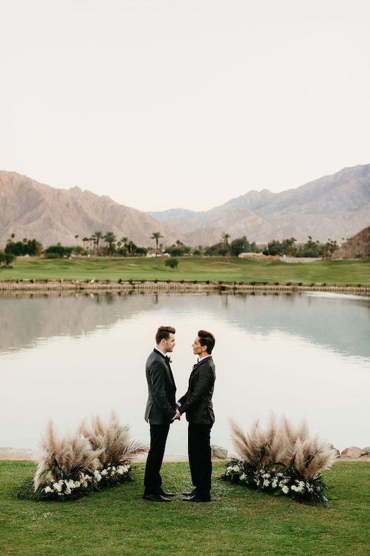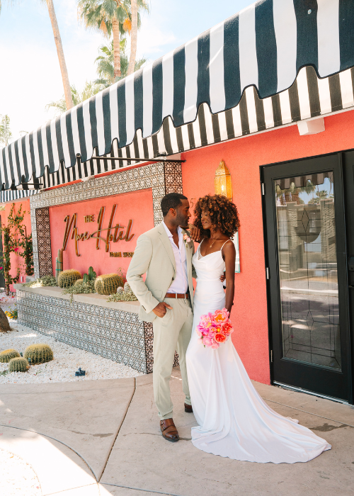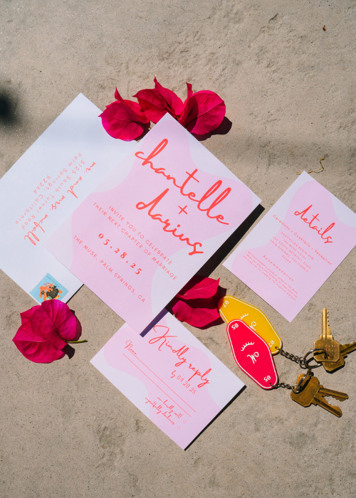“Palm Springs, a desert oasis known for its retro glamour, sun-soaked scenery, and mid-century modern architecture, has long been a favorite destination for weddings. The stylish boutique hotel set the perfect backdrop for festive vibes and endless desert views. The design team played off the natural beauty, creating a pink paradise with blush and fuchsia florals, bubblegum pink linens, and pops of hot pink, all balanced against the neutral desert tones. Modern minimalism marries retro flair.” — Sandra, Sandra Yvette Photography