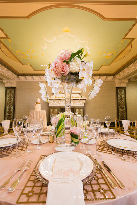 Pastel-kissed roses arched over the bride and groom at Europa Village, where the ambiance effortlessly transported you to the old-world villages of Spain, Italy, and France. Something blue lined the linen napkins while pearled edges added pristine elegance to the white china. Golden accents on the tablescape enhanced the romantic allure and a classic ceramic vase at the table’s center brimmed with white, peach, and blush-toned flowers. The tablescape exuded beauty and grace with an effervescent charm.