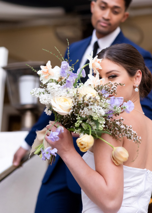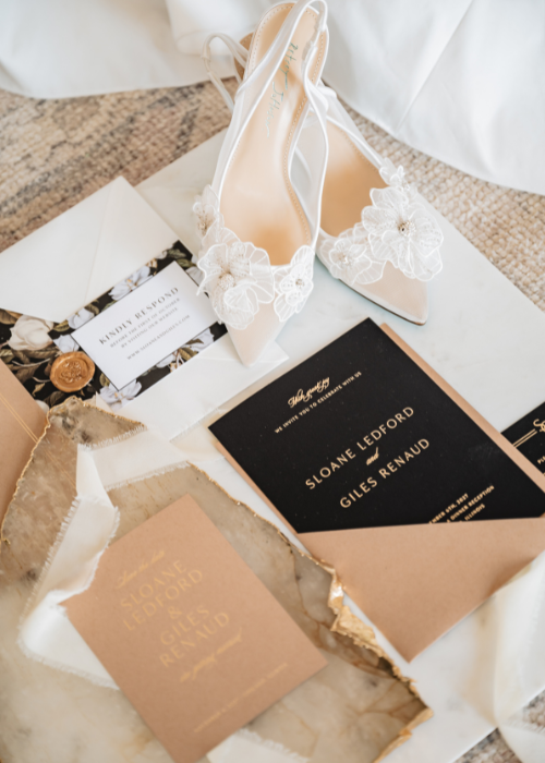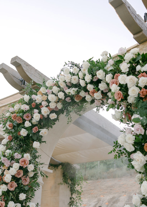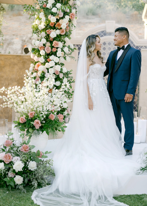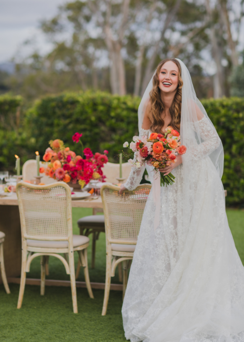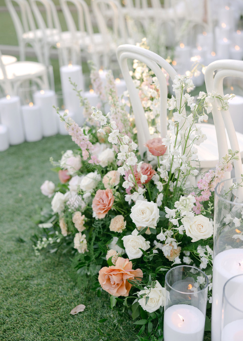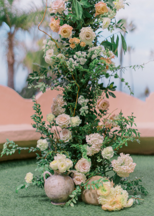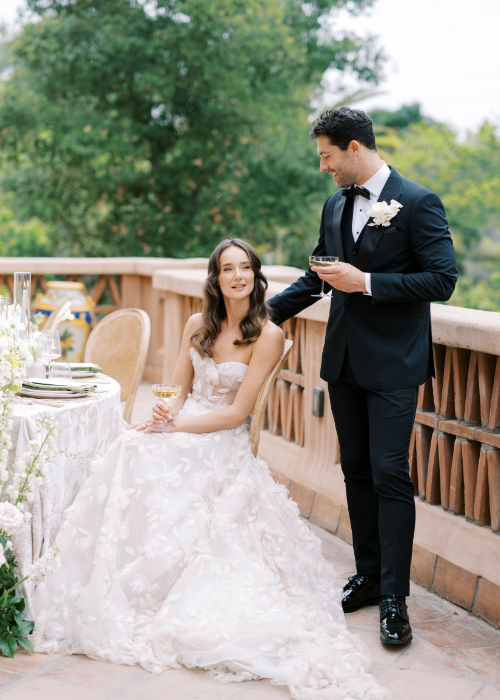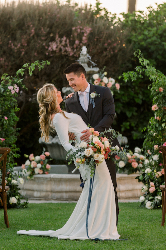 The iconic “Pink Lady of La Jolla” has welcomed guests for nearly a century. It’s the quintessential seaside setting for a stunning wedding celebration for couples seeking Southern California splendor and Mediterranean style. Meredith and Jasper’s perfectly peachy color palette enhanced the already spectacular ambience of the outdoor venue overlooking the sparkling Pacific Ocean. With whimsical touches like the bride’s pearl-accented heels and place settings with a playful font, the couple’s personalities tied a perfect bow on a breathtaking wedding package.