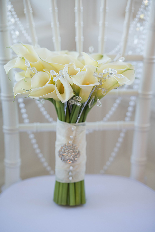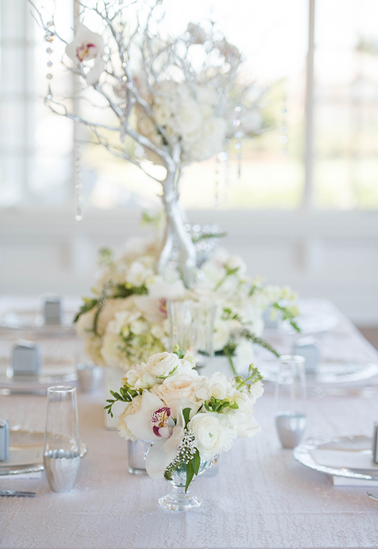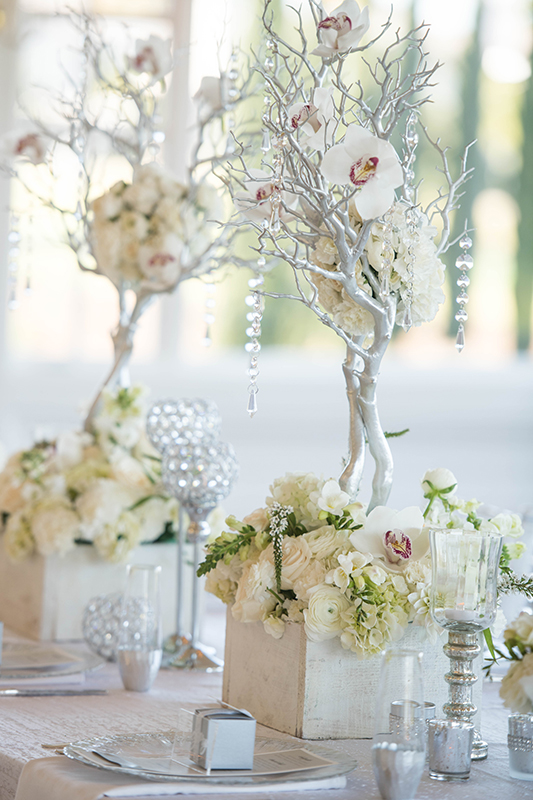 Take a more traditional approach with an added flair on your big day. White has always been THE color when you think of weddings. This design glams up the theme a bit with beautiful crystals and jewels throughout. From the swing styled table for the cake, to the dangling pearl ornaments, this wedding sure does take it up a notch.