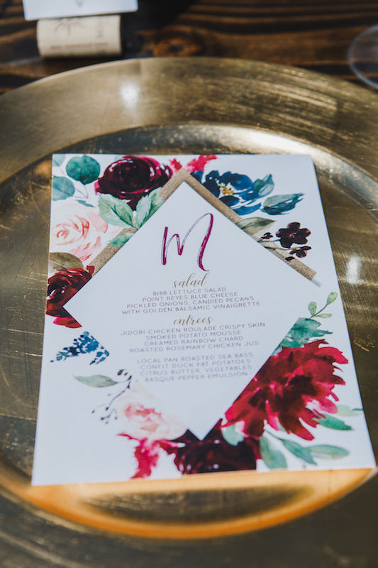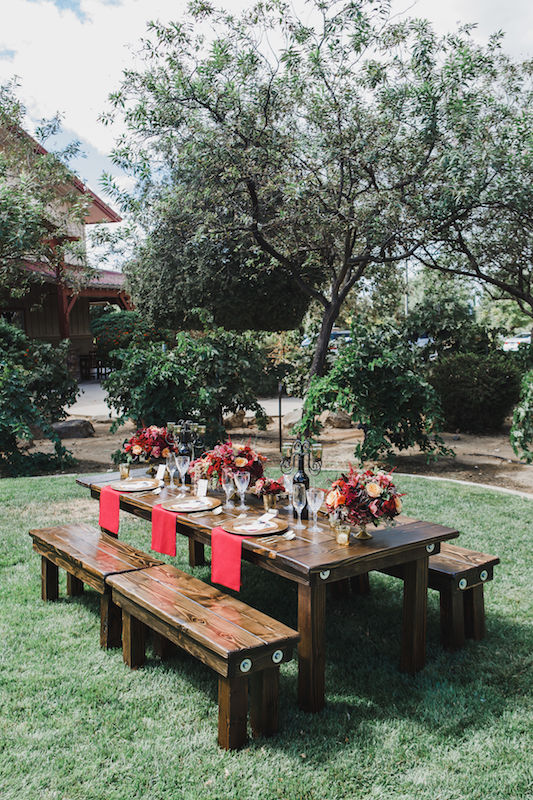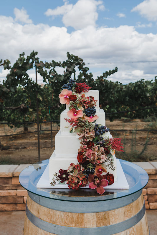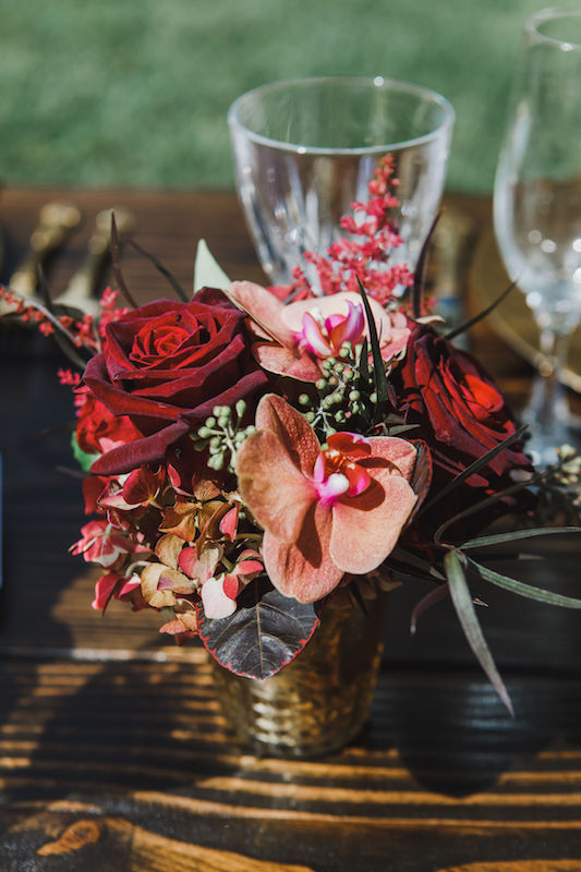 The beautiful winey setting provided the inspiration for this tablescape. Burgundy and deep dark red florals were used to represent the color of red wine and then accented with gold to provide the rich winery vibe in this simple yet elegant table. Grapes from the winery were used on the cake to pull it all together.