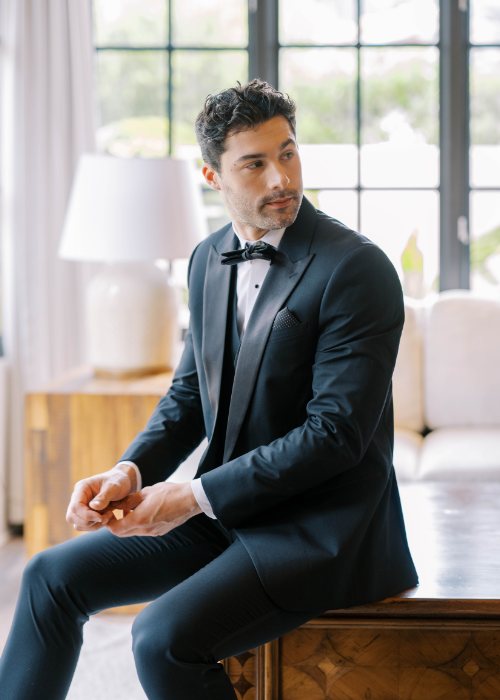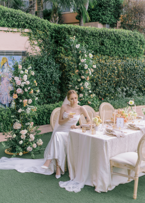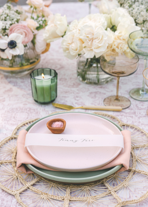 “Jeune Perché’s European-inspired estate, with its Mediterranean architecture and lush surroundings, provided an ideal setting. We curated the tablescape to complement the estate’s elegance without overwhelming it, using pale blush florals, and pops of anemones alongside rich greenery. The result was a refined, timeless look that fit seamlessly with the estate’s luxurious and intimate atmosphere. Cassie Goland (lead floral design with Adorations) and I worked closely together, combining our strengths to interpret Christie Turner’s vision perfectly.”