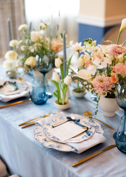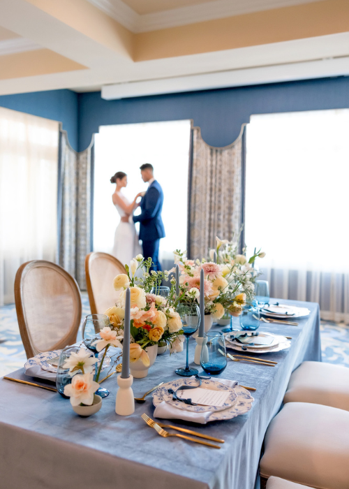 The Grande Colonial transported guests to Europe via La Jolla Village at this elegant celebration where a flair for French luxury was on prominent display. A love of “something blue” shone through-—from the groom’s dashing suit to the bride’s dazzling shoes, the Provençal place settings, and the delicate glassware. Demure floral arrangements in pretty pastels and creams completed the exquisite tablescapes, exuding European charm and lasting love in bloom.