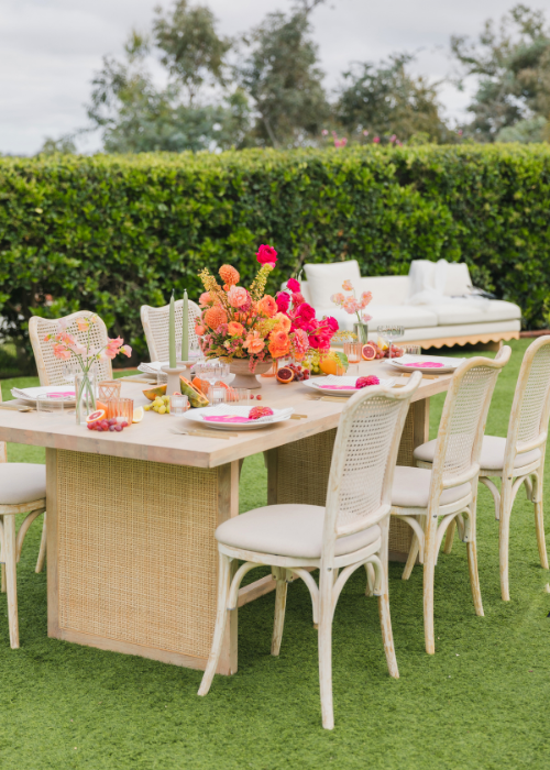 “The lush, sun-drenched gardens of Positano inspired this tablescape. Bright white ceramic plates are reminiscent of the cliffs overlooking the azure-painted sea. All of the citrus motifs and grapes echoed the vibrant colors of the coastal village. The abundant floral arrangement brought to mind a sunlit garden’s essence. Linen napkins drew inspiration from Positano’s natural beauty and charming simplicity, capturing the Italian coast’s warmth and romance.” — Sarah, Magnolia Events